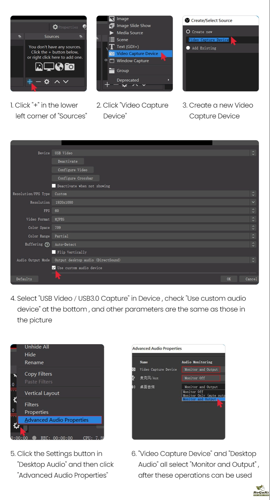 6. "Video Capture Device" and "Desktop Audio" all select "Monitor and Output", after these operations can be used