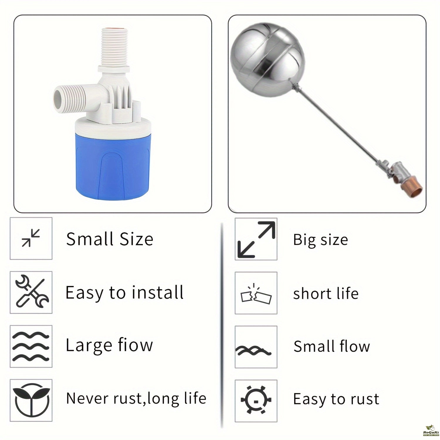 The float valve inside allows water to flow until a specific water level is reached. Once the water level reaches this level, the float valve is pushed up by the water due to buoyancy and stops the flow. The water level starts to drop, the valve will be再次 open and the water will start flowing again. When the water level is低于 the valve level, the float valve will automatically replenish the water for your tank, water tower, livestock, animal drinking fountain. Once it reaches the valve, it will automatically stop adding water, so when the water reaches the internal float, it will shut down. [easy to install] this is a mini float valve, ball size is small,所以 it is easy to install, male thread is 1/2 inch,我们 use bsp pipe thread, male thread is longer,它非常适合大多数 bsp threaded connections. If your pipe thread is npt, you just need to add some ptfe tape to the external thread, then it will be perfectly as well. The ball float valve inside [no electricity required] allows water to flow till a certain water level. Once the water level reaches this level, the float valve is pushed up by the water due to buoyancy and stops the flow. The water level starts to drop, the valve will be再次 open and the water will start flowing, so there is no electricity. It Is Used By People To Maintain The Water Level Of Garden Waterfalls, Yard Fountains, Rain Gutters Garden Projects, It Is Used To Automatically Shut Down Swimming Pools, Chicken Coops, Automatic Chicken Water Drinkers, Cattle Watering Droughts, Outdoor Rainwater Harvesting Buckets, Etc. The float valve works at a water pressure of 10psi to 150psi,如果 water pressure太低或太大, float valve将不适合使用,也不会工作或损坏。 Operating temperature: 0~60 degrees [easy to maintain] the float valve comes with a filter, and the filter must be used at the water inlet to avoid sand and gravel blocking the float. We use nylon as the valve body, using stainless steel screws, which will never rust and is very safe. [pase note] if you are using any type of autofill float indoors,请确保 you have an emergency overflow system. Any type of auto-fill float can eventually malfunction and cause flooding. It's a good idea to set the minimum water flow to maintain a full water level.
