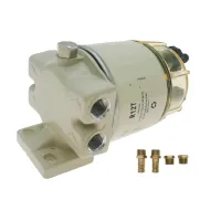 The Racor 140RS (2 micron) fuel filter/water separator features a variety of compact sizes to fit the most cramped engine compartments. 140R series feature 1/4-18 NPTF inlet and outlet fuel ports and an extremely low profile head design when space is at a premium.These units feature Spin-On contaminant collection bowls. The clear bowls used with these models will not discolor from alcohol, additives, or UV light and have a leak proof, positive seal drain for easy servicing. Water and contamination levels can be seen easily at a glance.Metal bowls should be specified when filtering fuels in hazardous locations where equipment is exposed to flying gravel and debris.