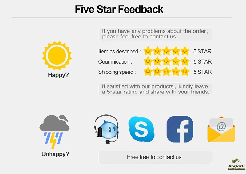 1. Please give us a five-start feedback if you are happy with the purchase. 2. It will be very grateful if you share pictures of the items in the feedback. 3. Please don’t give us a negative feedback without talking to us. We promise to solve any kind of problems as long as you contact us. |