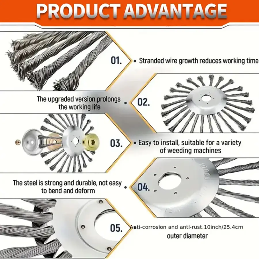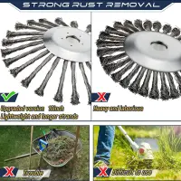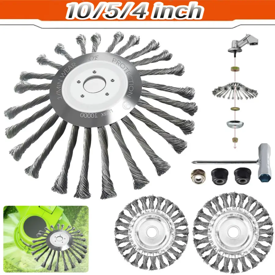 10inch Wire Brush Trimmer Head Universal Knot Steel Wire Grass Trimmer Head Removal Rust Derusting Weeding Wheel Lawn Mower Brush Cutter Accessories Feature: 1. Sharp and Efficient Cutting: The wire brush trimmer head features an internal fixed plate structure that ensures consistency and safety during operation. It's sharper and more efficient than other types, making it ideal for quickly cutting through weeds and brush in your garden. 2. Long Lifespan, Material: Made from carbon steel wire, the knot steel wire grass trimmer head is designed to withstand contact with rocks and hard objects, ensuring it can work normally under such conditions. Its lifespan is up to 10 times longer than other trimmer heads, offering you a solution for your garden maintenance needs. 3. Universal Fit for Versatility: The derusting weeding wheel is compatible with most trimmer models, especially suited for straight shaft garden pole tools. This versatility ensures that you can easily find a fit for your existing equipment, making it a convenient addition to your gardening toolkit. 4. Wide Range of Uses: The steel wire wheel is primarily designed for deburring, dust removal, oxidation removal, cleaning, and polishing accessories. Its wide application range makes it an essential tool for not only garden weeding but also for maintaining and cleaning various outdoor areas and equipment. 5. Easy to Use with Flexible Performance: Offering smooth performance and flexibility, the garden weeding brush is designed for convenience. Its twisted wire design provides the flexibility needed to tackle different weeding and cleaning tasks, making your gardening and maintenance work easier and more effective. . Specification: Origin: Mainland China Material: Stainless Steel Aperture: about 25.4mm Product size: about 254.00x254.00x51.00mm Product size: 10x10x2.01inch Note: 1 x Wire Brush Trimmer Head ![]() ![]() ![]() ![]() ![]()  |