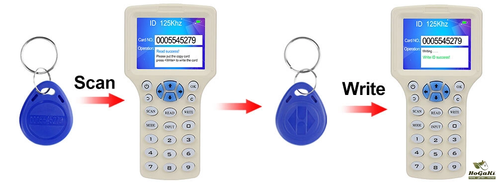5. Put one writable T5577(125khz writable chip) or UID(13.56mhz writable chip) card on the back side of the copier and press "Write"