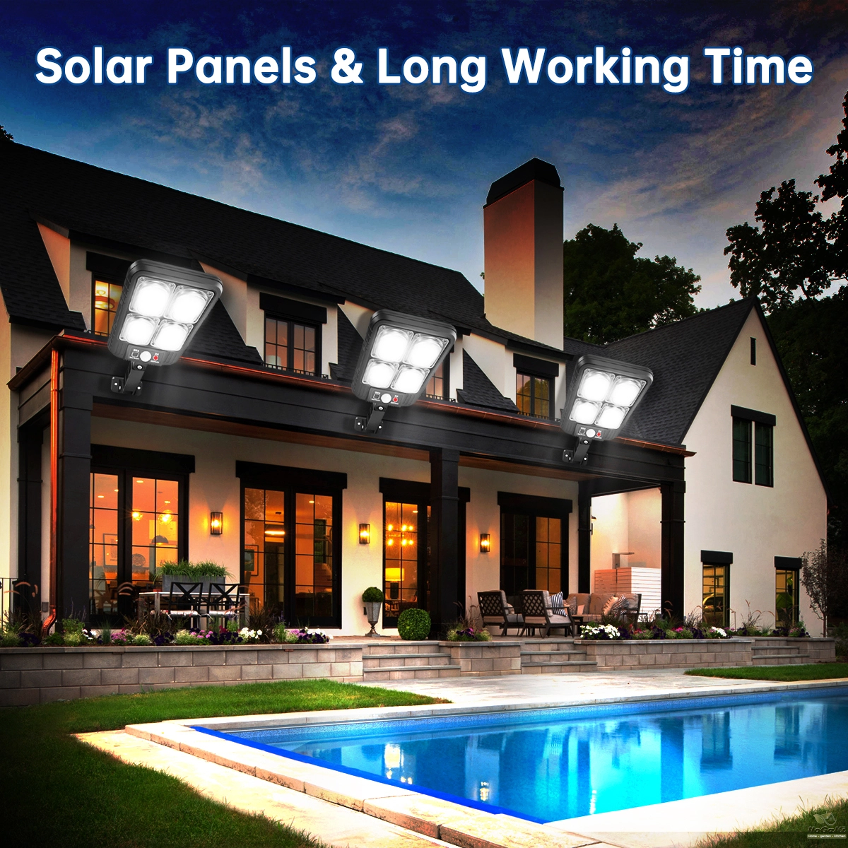 【Extremely Bright Motion Sensor Outdoor Lights】--Solar lights outdoor uses high efficiency 100/200pcs high bright LED beads; The super output power exceeds other solar lights, The solar lights are equipped with 1200/2400mah battery , the working life is more than 50000+ hours, it only takes 6-8 hours to fully charge during the day;