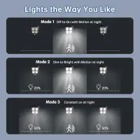 【Remote Control & 3 Lighting Modes】--Mode 1: The solar light stays off until motion is detected, the solar light turns on and turns off again after 20 seconds; Mode 2: The solar light keeps 20% brightness until motion is detected, the solar light turns to 100% brightness, 20% brightness will be restored after 20 seconds; Mode 3: The solar light is always on, maintaining 50% brightness;