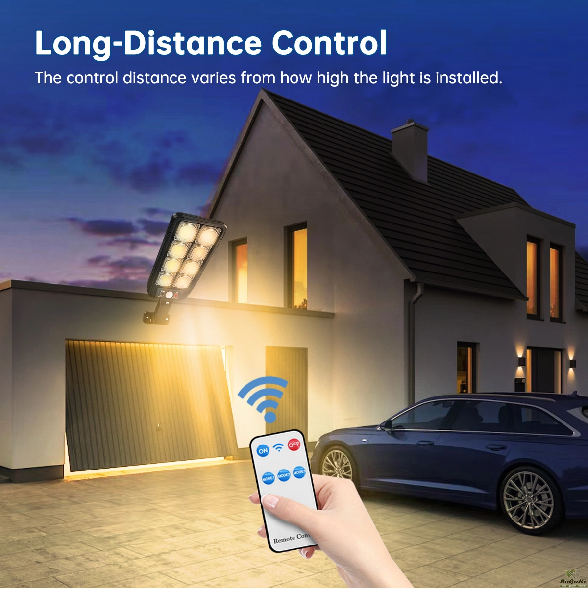 【Remote Control & 3 Lighting Modes】--Mode 1: The solar light stays off until motion is detected, the solar light turns on and turns off again after 20 seconds; Mode 2: The solar light keeps 20% brightness until motion is detected, the solar light turns to 100% brightness, 20% brightness will be restored after 20 seconds; Mode 3: The solar light is always on, maintaining 50% brightness;