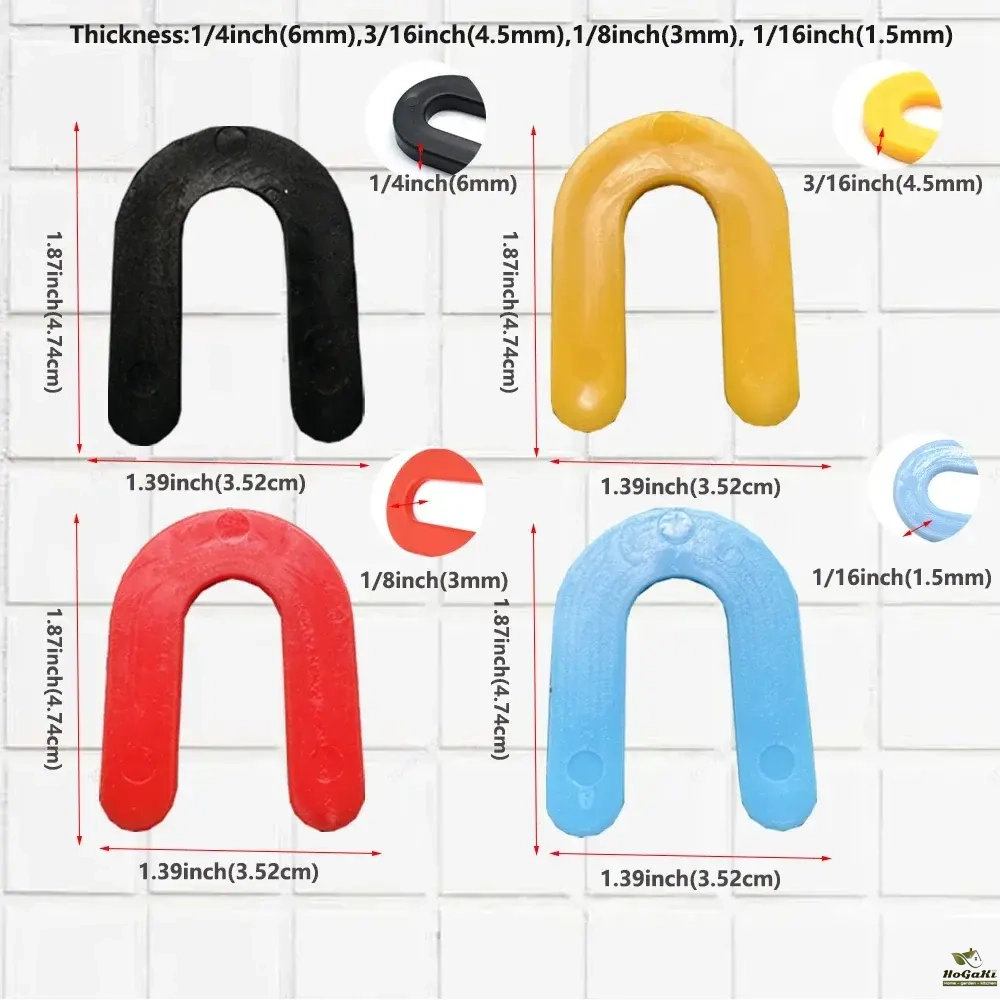 Specification:Material: PPProduct Color: Blue, Red, Yellow, BlackProduct Size: Thickness: Blue: 1.6mm, Red: 3mm, Yellow: 4.7mm, Black: 6.2mm------------Package Included:100 x U Shaped Tile Leveling Shims