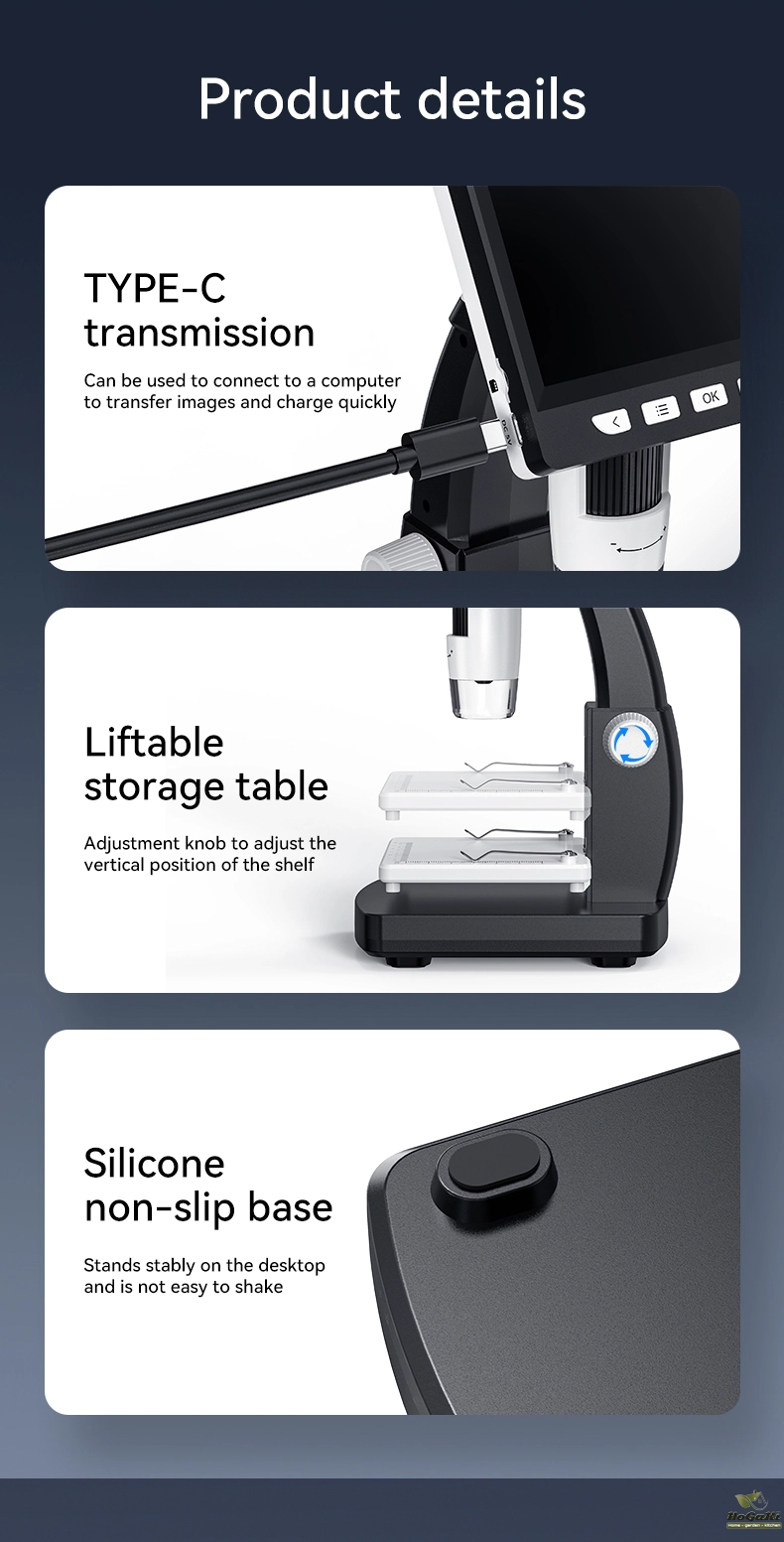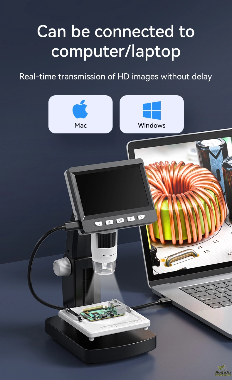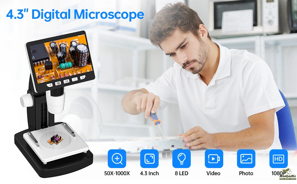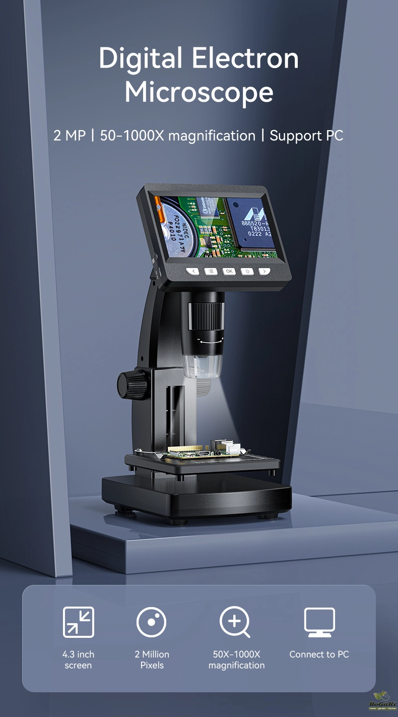 Digital Electron Microscope,Using 1080P high-definition lens, the 4.3inch LCD screen displays real-time clear images and high-quality video, with 8 LED fill lights. Compared to traditional eyepieces, the large screen enhances ergonomics and eliminates eye and neck strain.
