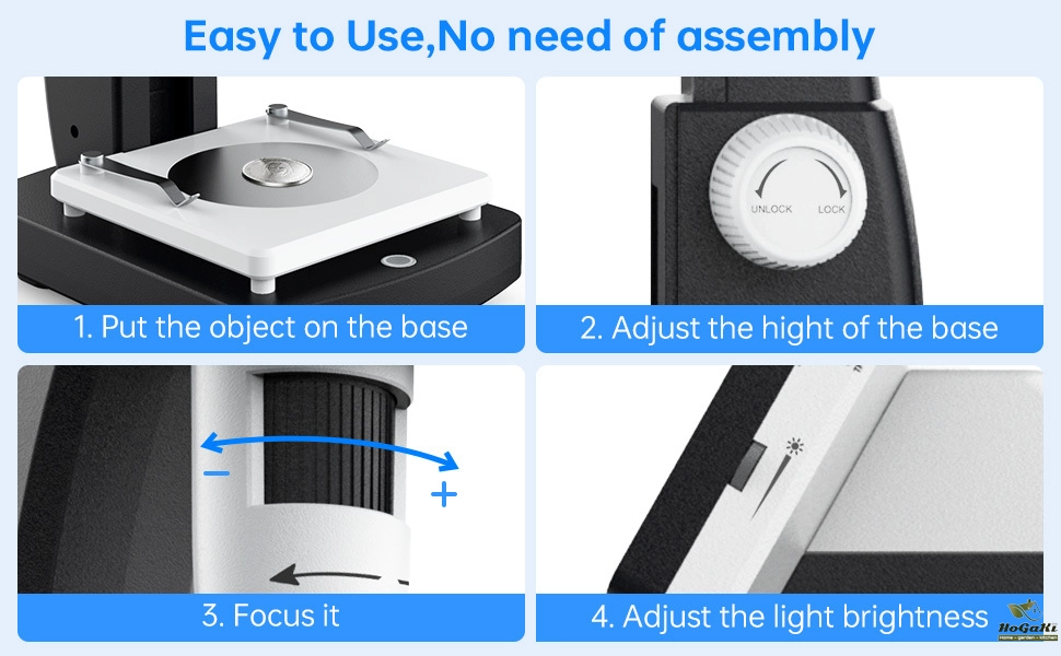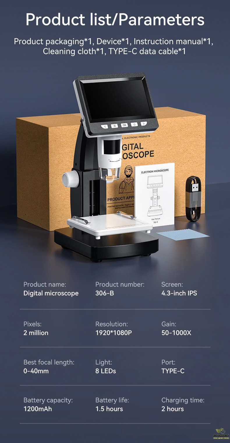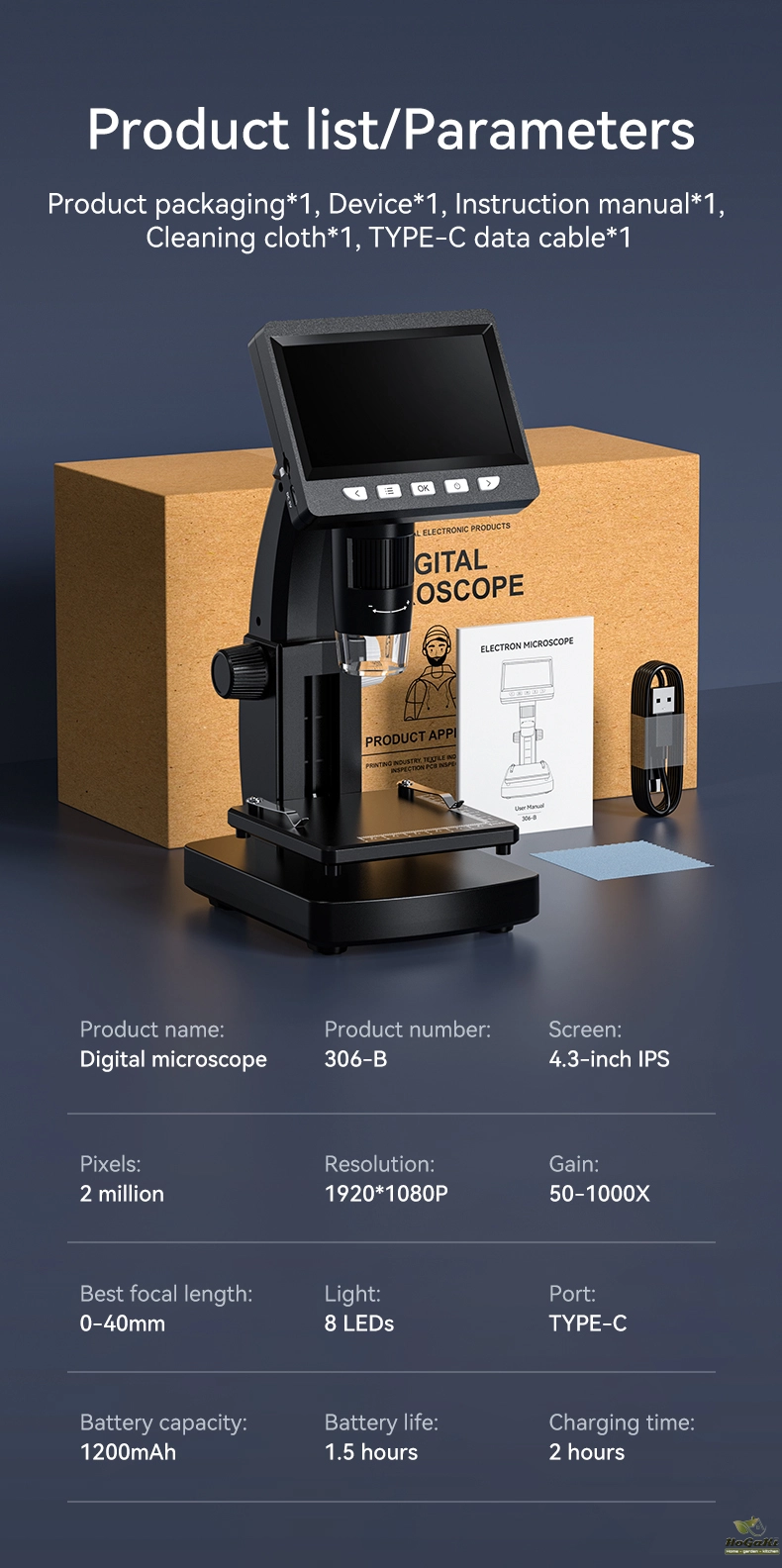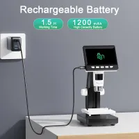 【IPS LCD Dispaly】This electron microscope is equipped with a 4.3-inch screen, and also has a 2-megapixel ultra-precise focus camera and 1080P high-definition imaging. You can directly observe the real-time clear image and high-quality video of the object, which is very convenient to use. Compared to eyepieces, the large screen lends itself to ergonomics and eliminates eye and neck strain.