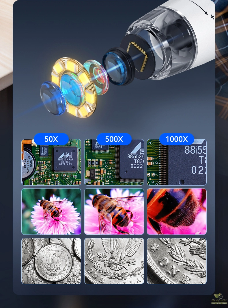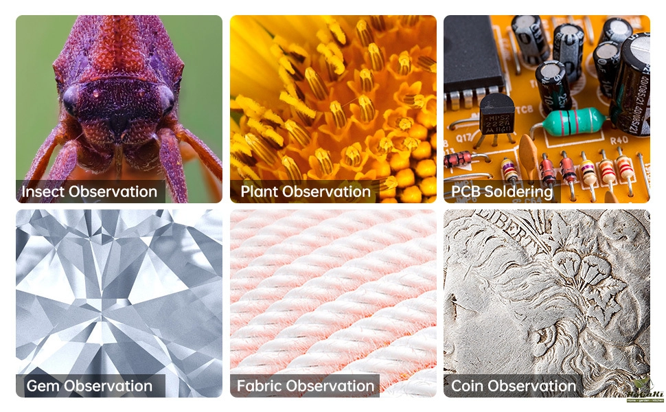 50X-1000X Continuous Magnification Zoom—Allows you to zoom in and view incredible detail in the 50X to 1000X magnification range. The actual magnification differs due to the screen size, the distance between the camera, and the observations.
