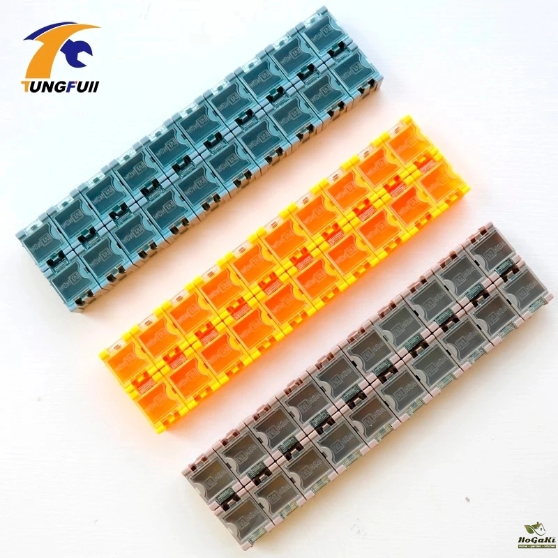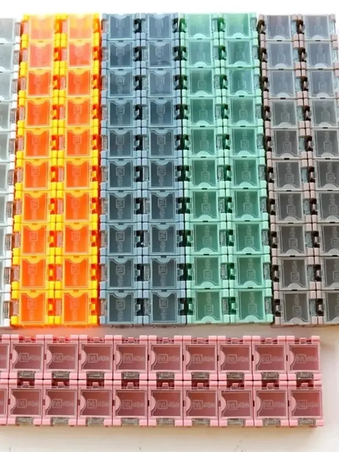 Made of high quality plastic ,this storage is specially designed for electronical components.It has 4 colors ,you can put the congener components in the same colour ,easy to memory.you can combine them together in different shape different manner using different colour. The lip of the storage using the elasticity theory make it more close.even the tiny components can't drop from it.