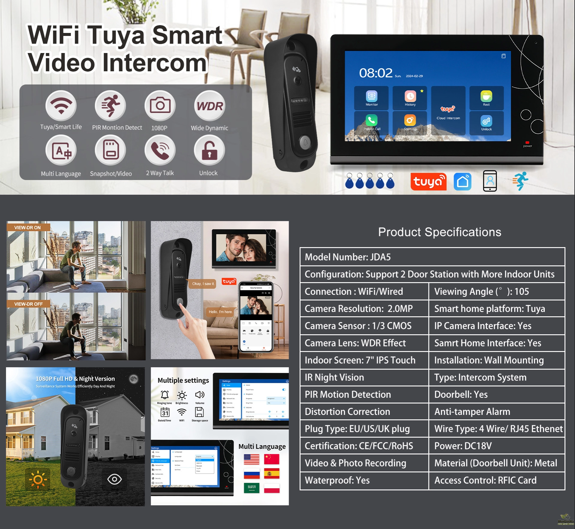 Wireelss Video Doorbell Intercom with 2 Unit 7 inch Touch Monitor System(Wired),1080P Video Entry Doorphone Door Camera,TUYA WiF