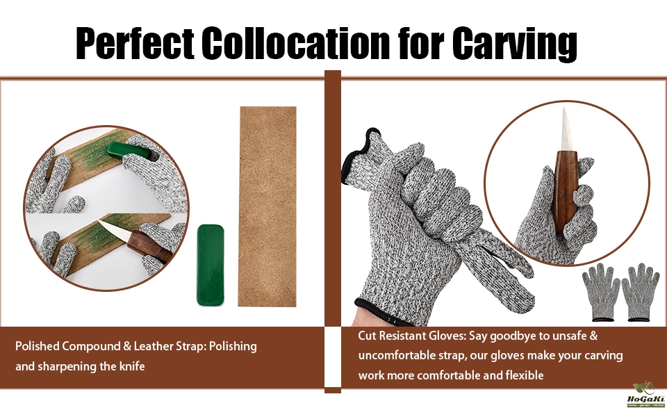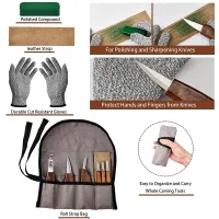 WOOD CARVING SET: The whittling kit set includes 6 wood carving knives. A pair of non-slip and wear-resistant gloves, a sharpening leather, a whetstone, and a tool bag.
