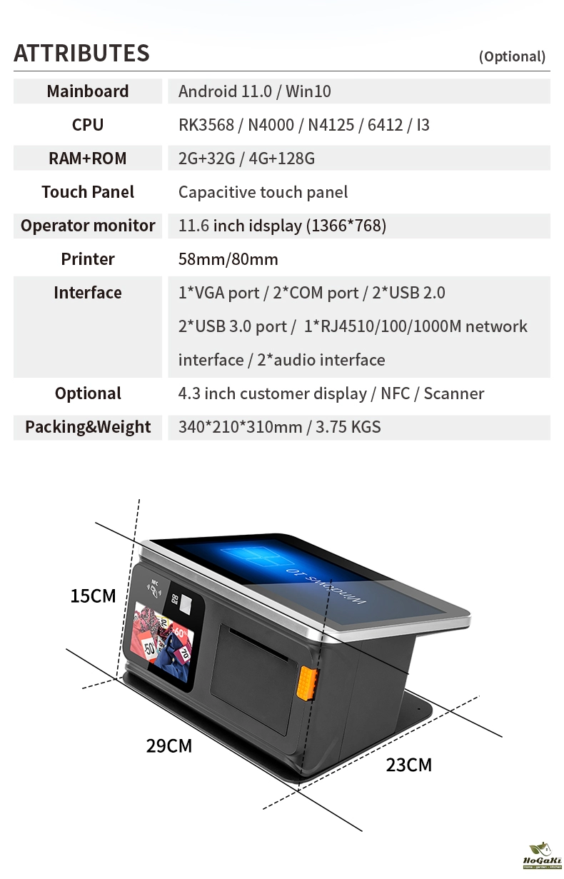 4. Rich options:Intel i3/i5 CPU available, 4G/8G DDR, 64G/128G/256G eMMC, 58/80mm Thermal Printer