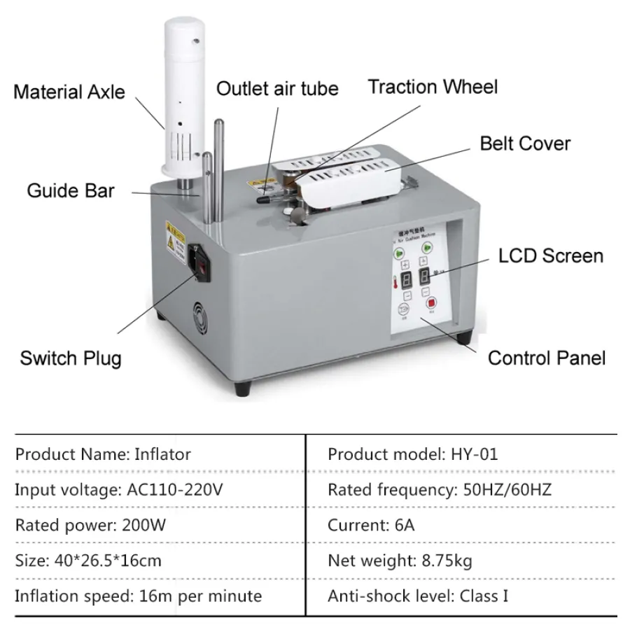 HY-01 is a compact multifunctional air inflation machine made of pure metal with a long service life. It's portable, with a user-friendly operation interfacecompatible with different types of inflatable bags. Temperature and air volumespeed can be adjusted according to requirements