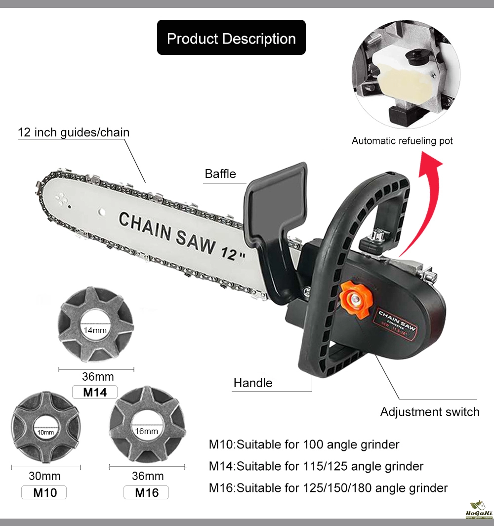 Angle grinder modified electric saw, integrated guide plate, high hardness chain, chain tightness adjustable, safety protection thickened baffle, visible fuel tank, easy to cut metal, wood, glass and other materials, practical and convenient.