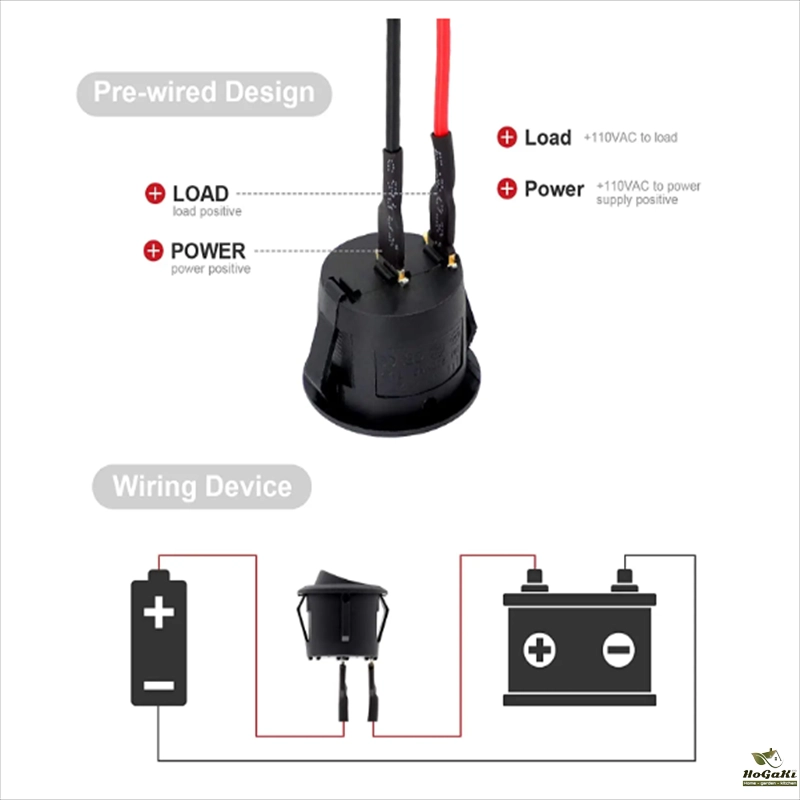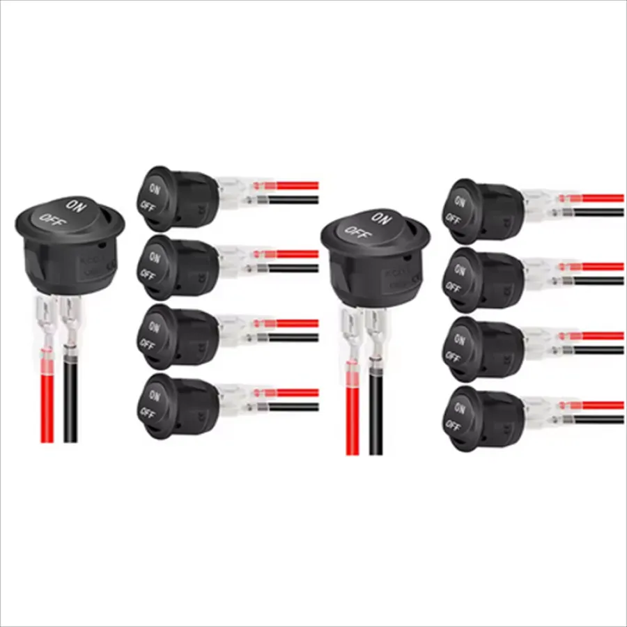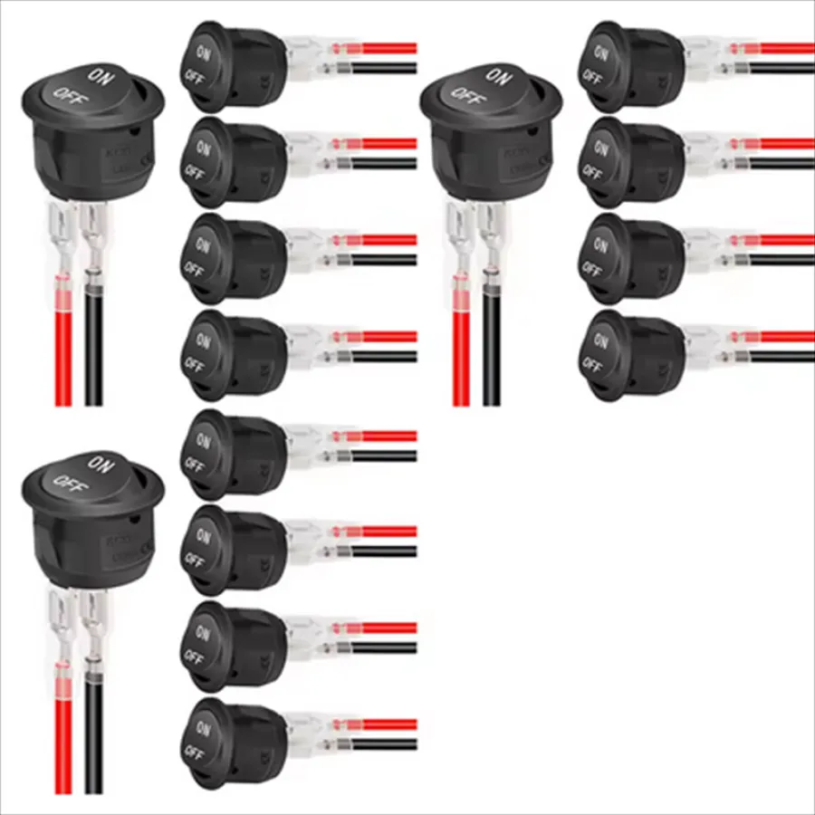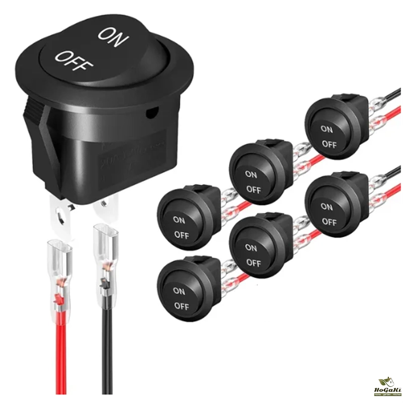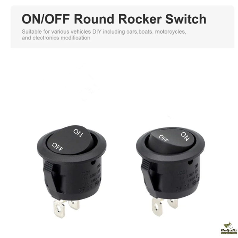 Round Rocker Switch: This is an on off switch 12v, 2 pin switch, SPST 2 position design. When turn the 12v switch ON, it will stay at ON position until manually switch it off. Small Switch Rating: 20A 12V DC; 10A/125VAC; 6A/250VAC.