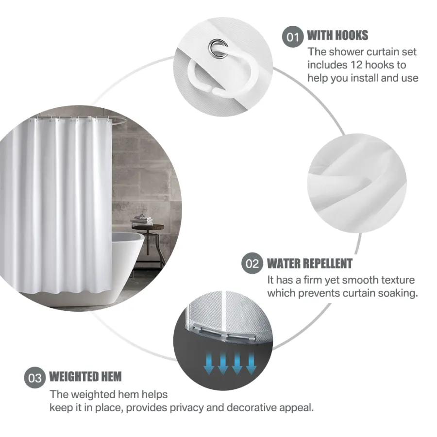 REINFORCED HOLES: Reinforced button holes work with most types of shower hooks and ring for quick and simple installation (with 12pcs hooks); Top hem is reinforced to hold up to long term use and will help this curtain keep its shape; This shower curtain will complement any bathroom, use at home, apartment, condo, hotel, camper, RV, dorm, school shower, athletic club, gym and everywhere else you need a reliable shower curtain or liner.