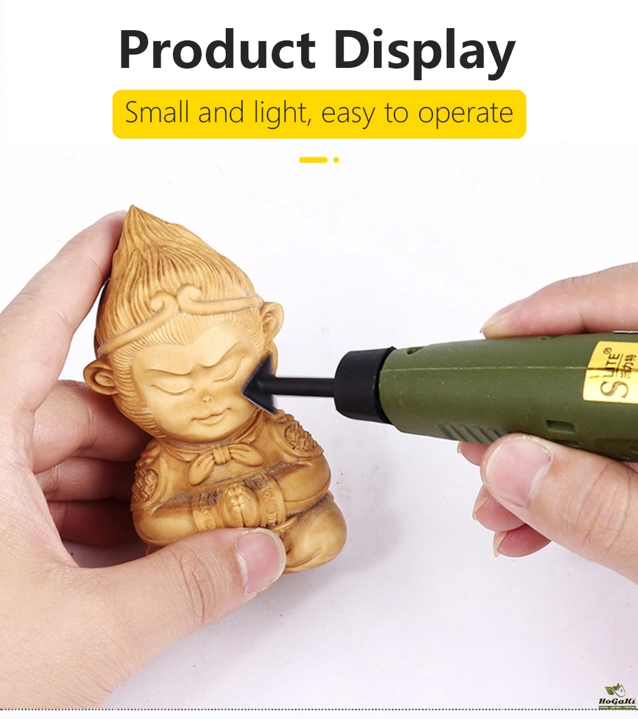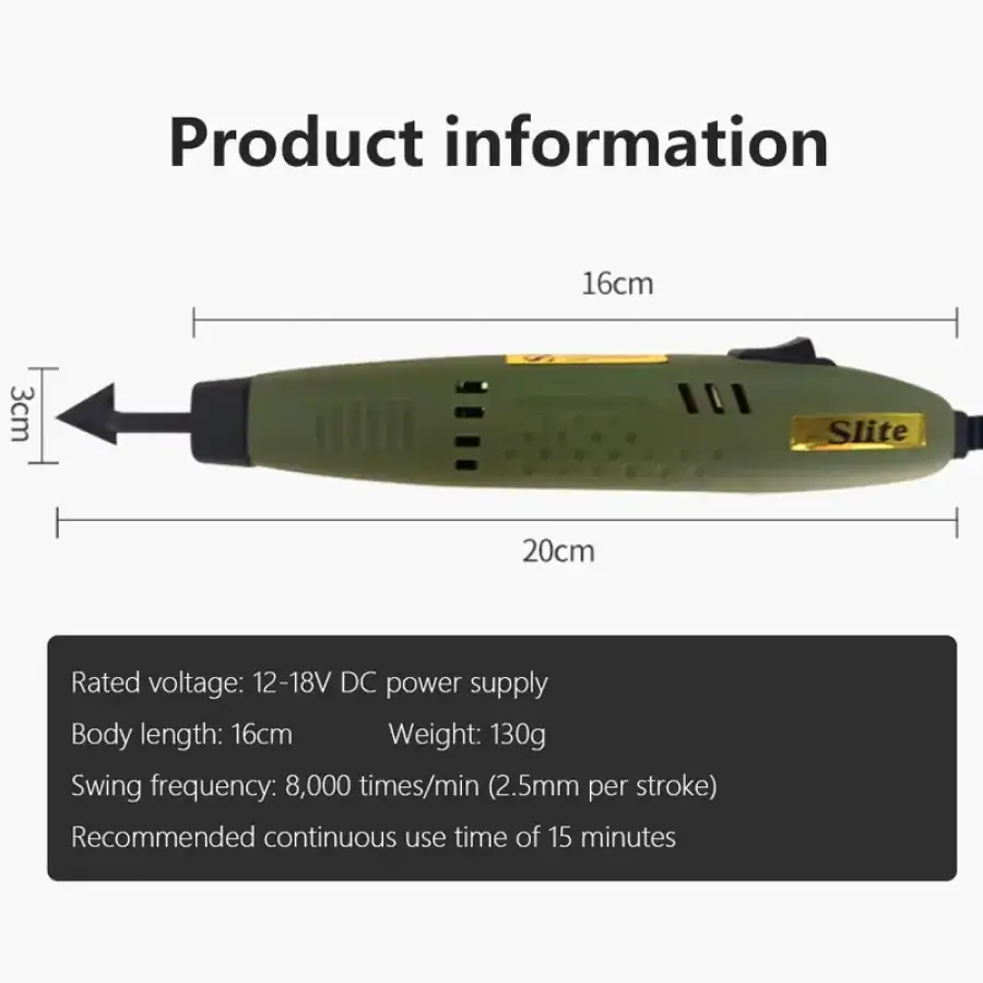 High frequency linear grinding pencil sander, for small complex surface polishing.Not Suitable for factories, engineering, workshop production and other continuous production and processing use, continuous working time 15 minutes to stop for a while! Polishing grinding head, gently touch the polished surface can not beat the pen shaped sander, it is not easy to achieve the grinding effect, it will cause the motor load increase motor rotation loss.