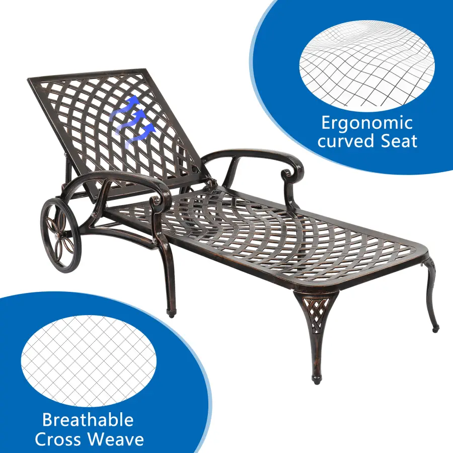 193*64.5*93cm Backrest Adjustable Courtyard Cast Aluminum Lying Bed Bronze is a common but practical one. For the ordinary use, it is a chair only. For the special purpose, it can be extended as a reclining chair. How convenient and practical it is! Made of premium  aluminum materials, this chair is stable, durable and reliable to use. You can also send this multifunctional chair to your dear friends or families as a gift. Nice choice!