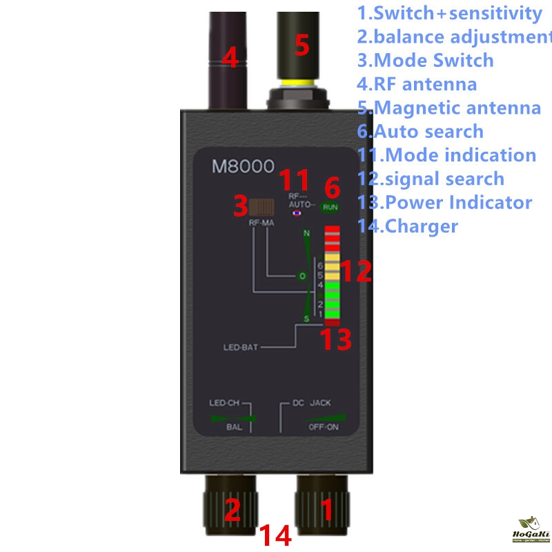 1.Auto Search:if you want to check the room or car safe or not,you can put it in one room or car,then open the auto search,it will search automatically,once received one time of signal,the light bars will light one,if received 6 times,the light bars will light at 6 lights,then it will sound alarm to remind you that there is a suspicious signal