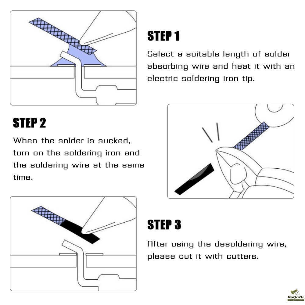 1) Place the wick over the solder need to be removed and then push the heated soldering iron tip onto the wick.