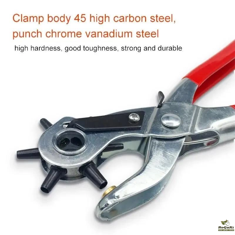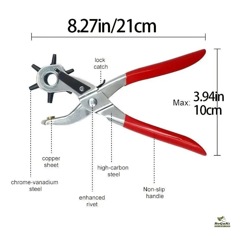 The folding punching pliers are made of special steel as a whole. The punching head has six rotatable holes with different diameters. The hole heads are heat-treated to make the punching fast and accurate. The diameters of the six holes are 2mm/ 2.5mm/3mm/3.5mm/4mm/4.5mm, users can adjust according to their own needs, turn the hole head forward in the direction of the arrow to choose different sizes of holes, manual operation is convenient and fast.