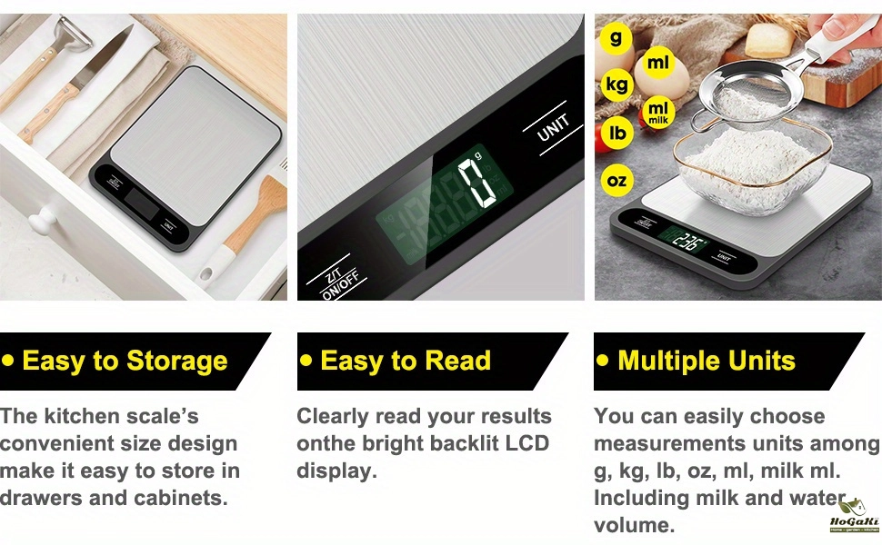 【Multifunction Scale】This digital kitchen scale has 6 measurement unit to meet all the food weight that you need: g, kg, lb, oz, ml, milk ml. Big bright LCD display easy to read.