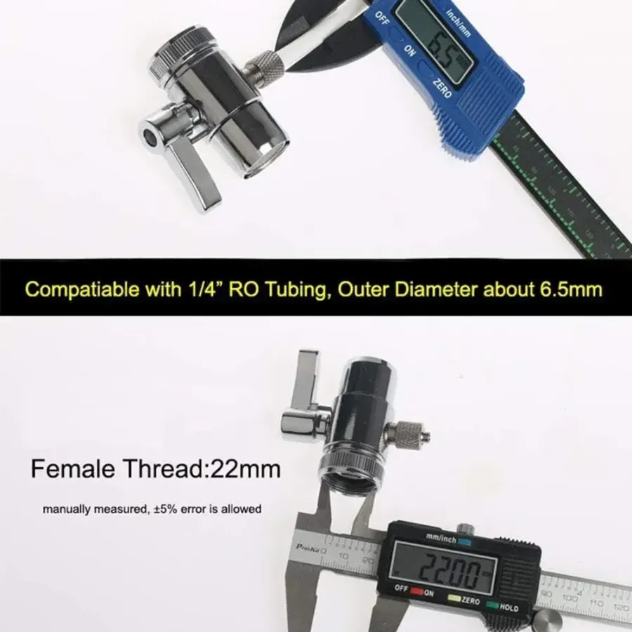 2. Faucet Diverter Valve M22 (22MM) female thread; RO tubing Outlet Diameter: 1/4"Tube O,D. ; Compatible with most standard size faucets or any appliance that hooks to 1/4"plastic tubing.