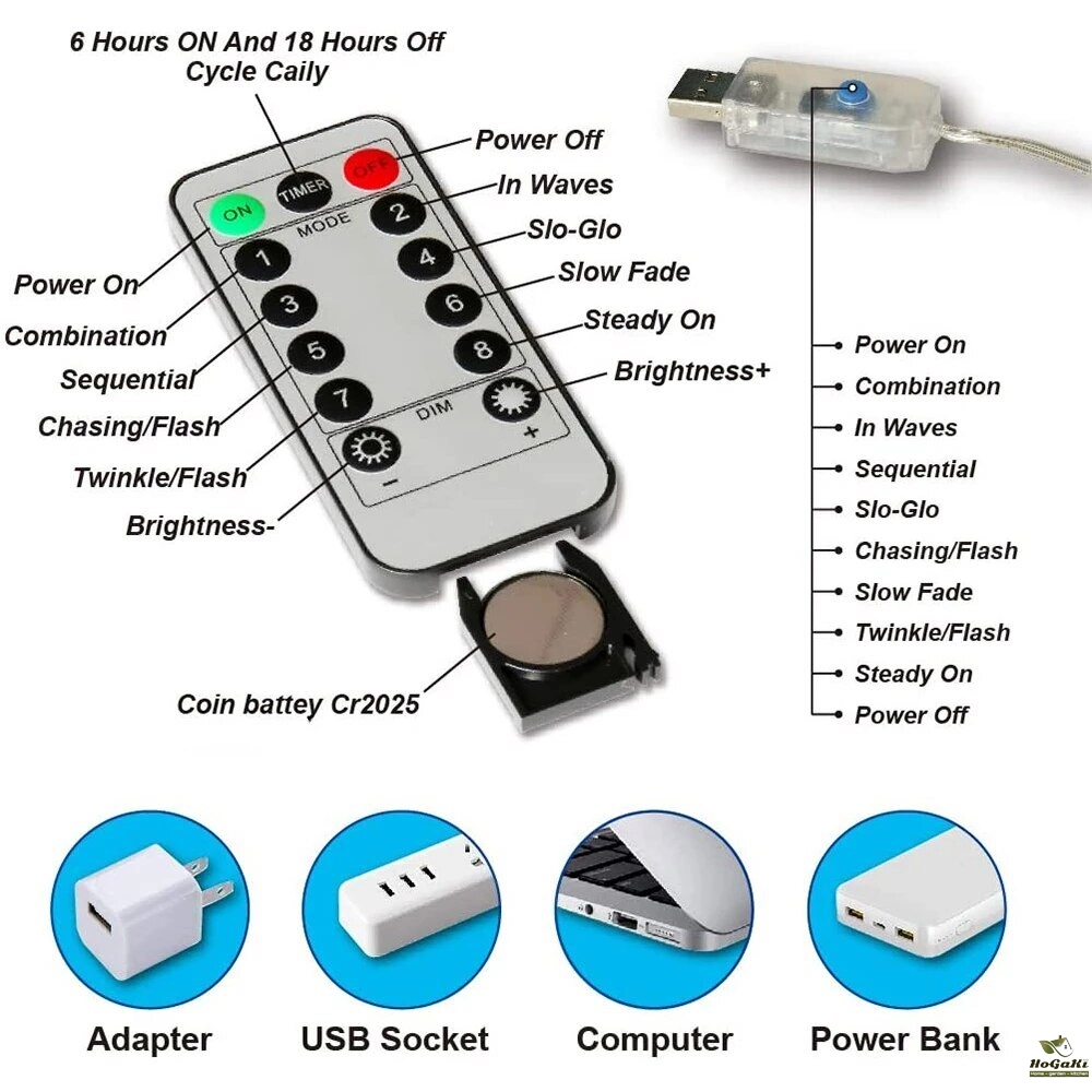 We recommend you use a 5V 1A-2A USB adapter. The buttons on the USB can turn on / off and control the mode. The remote requires a CR2025 battery, but it is not included.