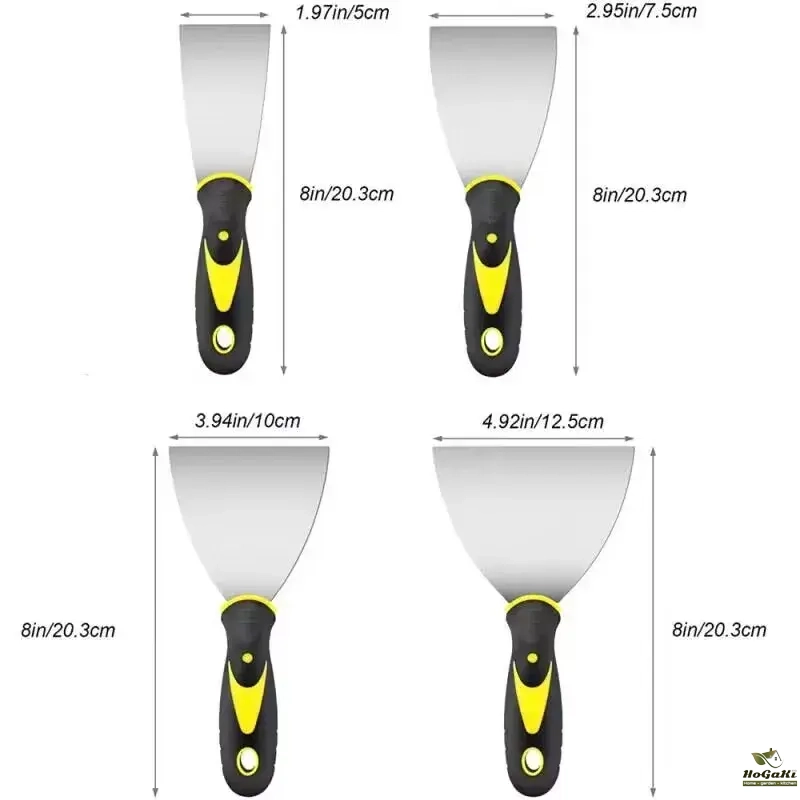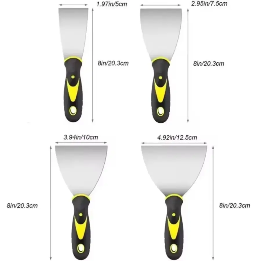 The Putty Knife Set comes with five different sizes of putty knives for almost any job. They are made of high-quality stainless steel, which is strong, durable and non-corrosive, making them no less than 4-in-1 tool putty knives.