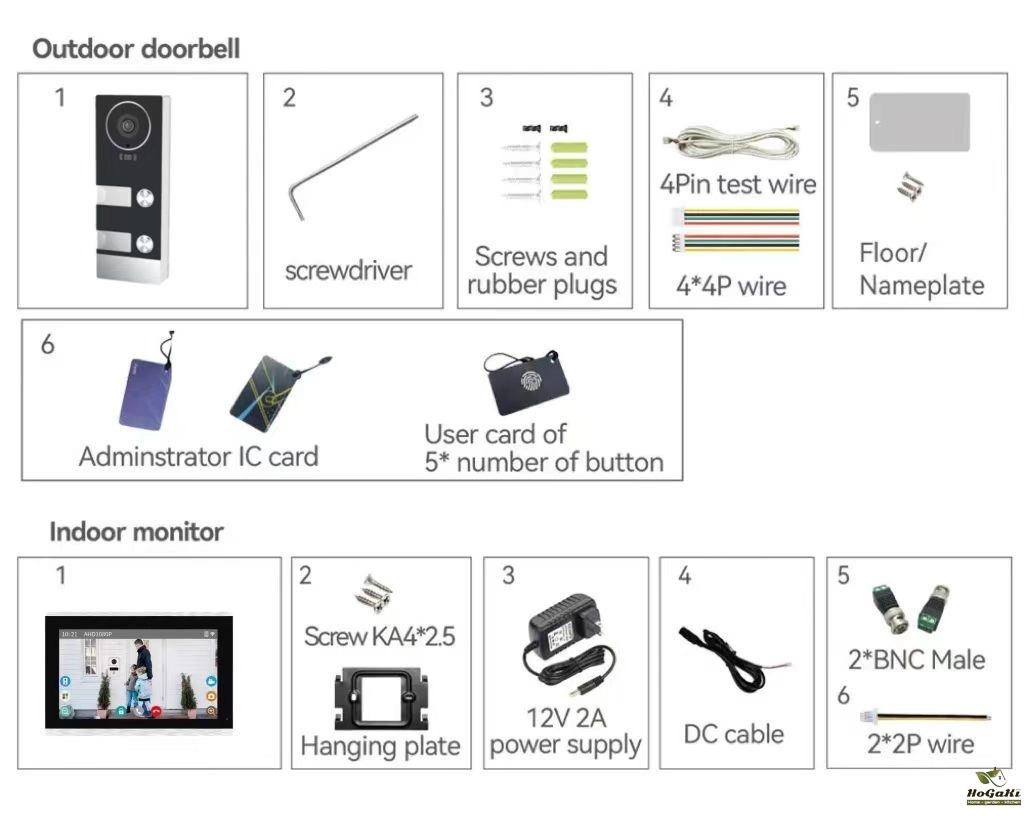 Power adapter:Each indoor monitor connect a 12V 2A power adapter, outdoordoorbell doesn't need separate power supply;