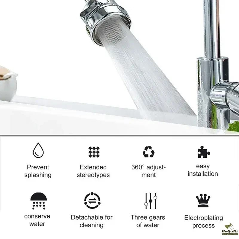 three-speed booster; water splash prevention; extended orientation; 360° universal rotation; simple installation; water leakage prevention; water saving
