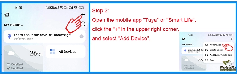 Step 2: Open the mobile app "Tuya" or "Smart Life", click the "+" in the upper right corner, and select "Add Device".