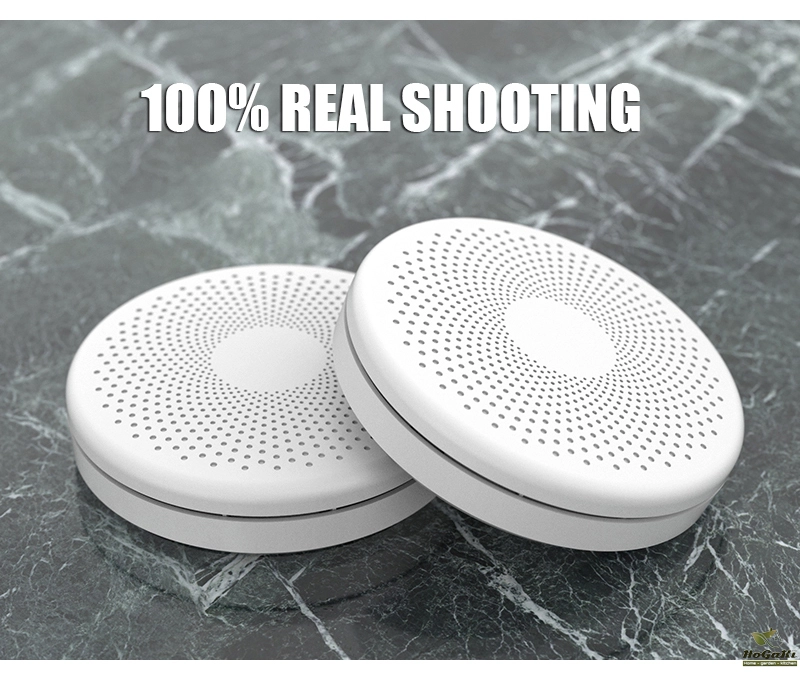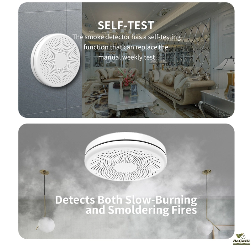 In the smoke test, you can inhale a puff of smoke, and then use a straw to spray the smoke into the side gap of the device, so that the smoke enters the interior, and the sensor will recognize the smoke and issue an alarm sound. (Note: 11 round holes in the surface are sound outlets)