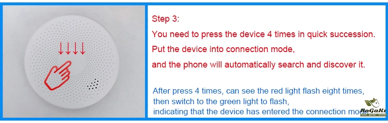 Step 3: You need to press the device 4 times in quick succession. Put the device into connection mode, and the phone will automatically search and discover it. (After press 4 times, can see the red light flash eight times, then switch to the green light to flash, indicating that the device has entered the connection mode)