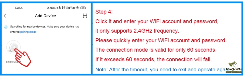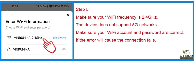 Step 5: Make sure your WiFi frequency is 2.4GHz. The device does not support 5G networks.Make sure your WiFi account and password are correct. If the error will cause the connection fails.