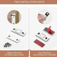 3.The double-side adhesive tape is strong enough to stay cabinet shut without drilling screw holes to screw it in. Time saving and also protect your expensive cabinet from damage. Also provide screws for your installation. Please close and open the door after 12 hours in order to make the adhesive compound adhere well on this surface.
