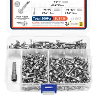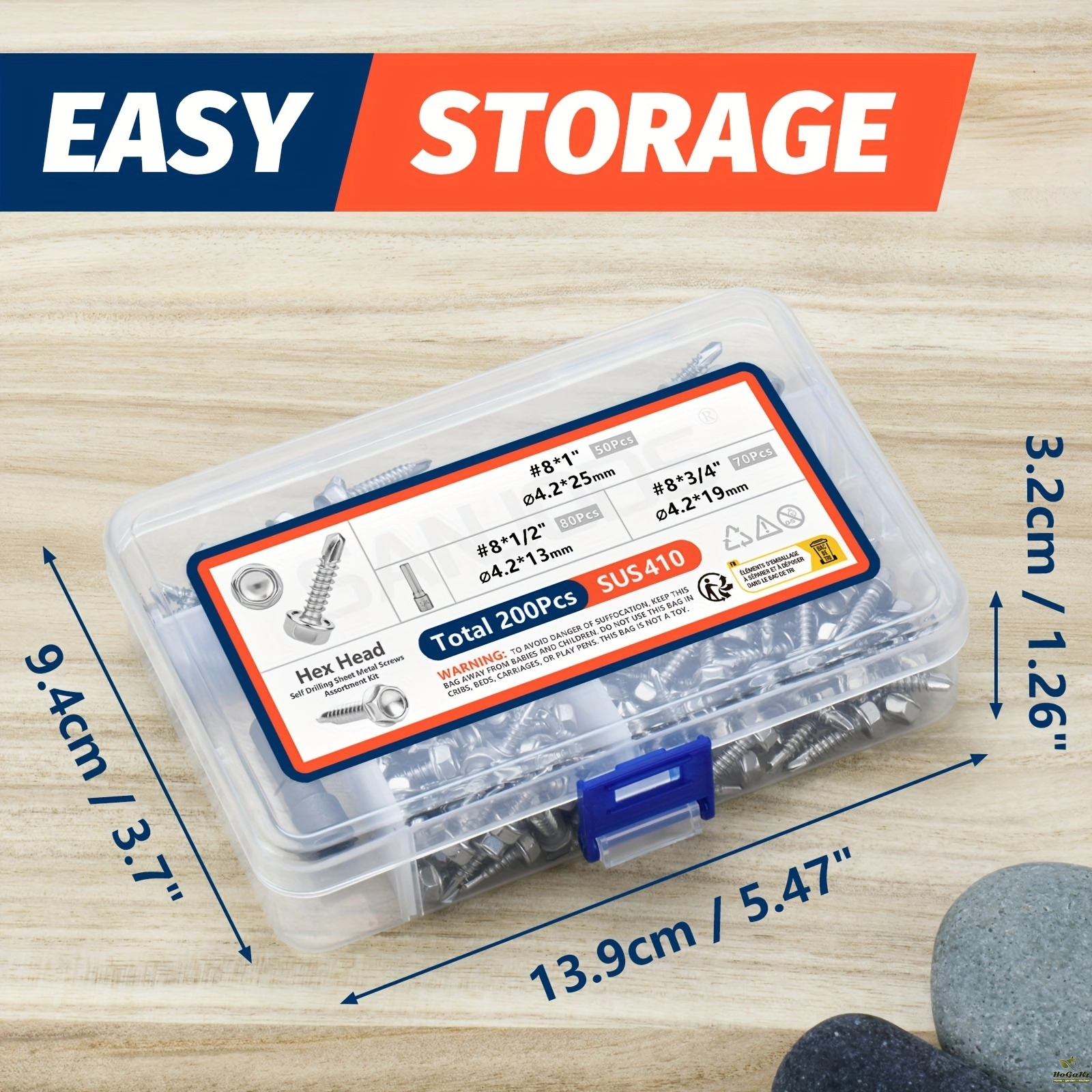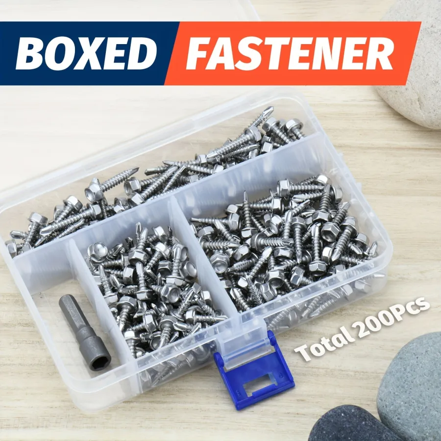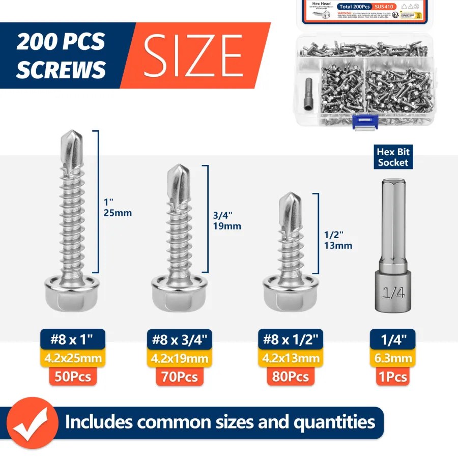 【Package Included】200pcs #8 (4.2mm) Hex Washer Head Self Tapping Screws ( 1/2"- 80pcs, 3/4"- 70pcs , 1"- 50pcs ); 1pcs Hex Bit Socket.