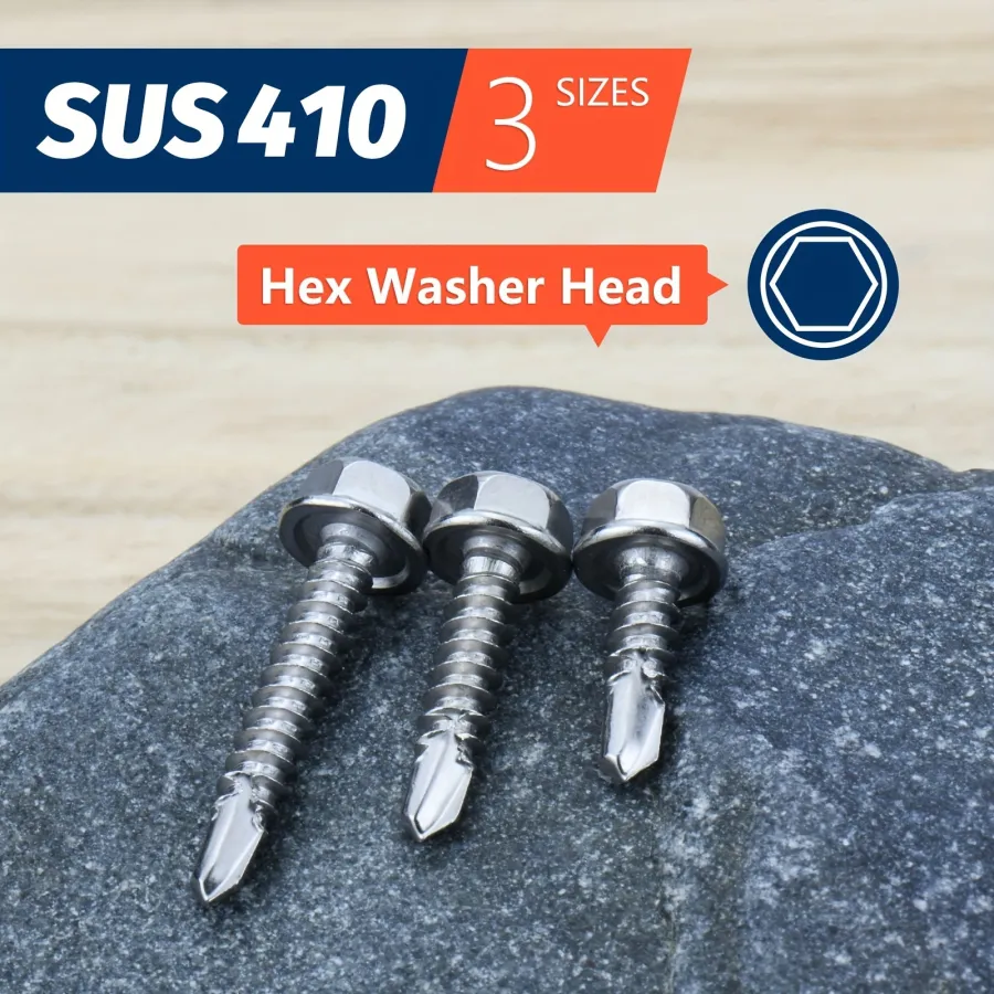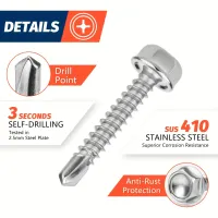 High Quality Stainless】These Hex Washer Head Self Drilling Tek Screws are 100% 410 Stainless Steel which is one of the highest forms of corrosion resistant steel, making it last longer than other hardware on the market today.
