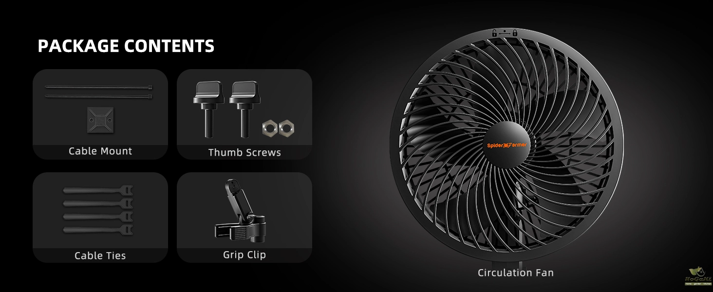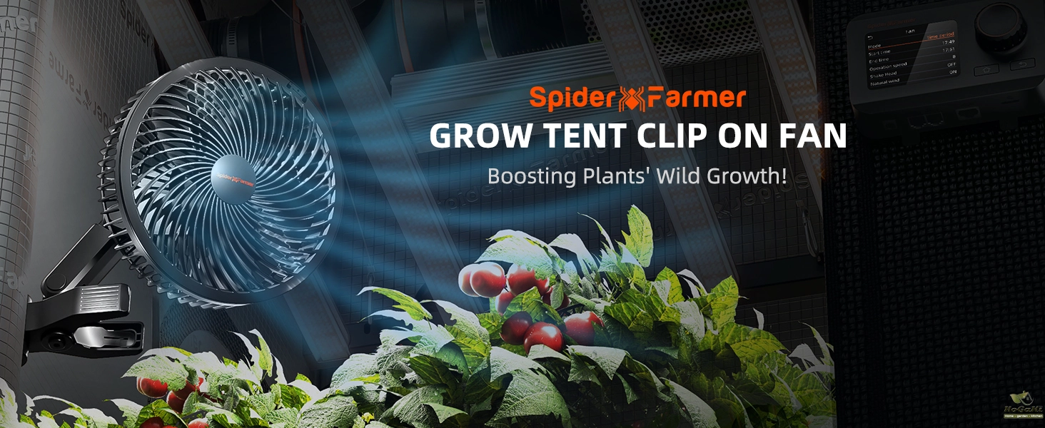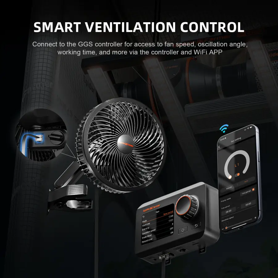 The clip fan links to the GGS Power Strip AC5/AC10 and via an RJ12 cable, enabling remote control through Bluetooth or the Spider Farmer APP. Seamlessly connect to the Spider Farmer GGS Series for smart control over fan speed, oscillation angle, and working time.