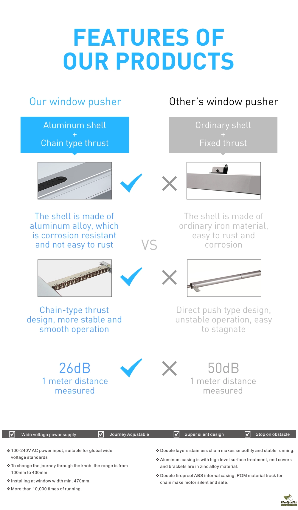 -Stainless steel-made double layer chain, operate smoothly.