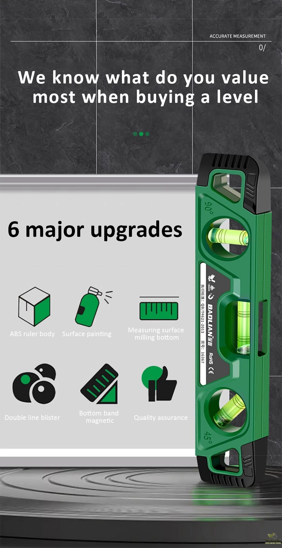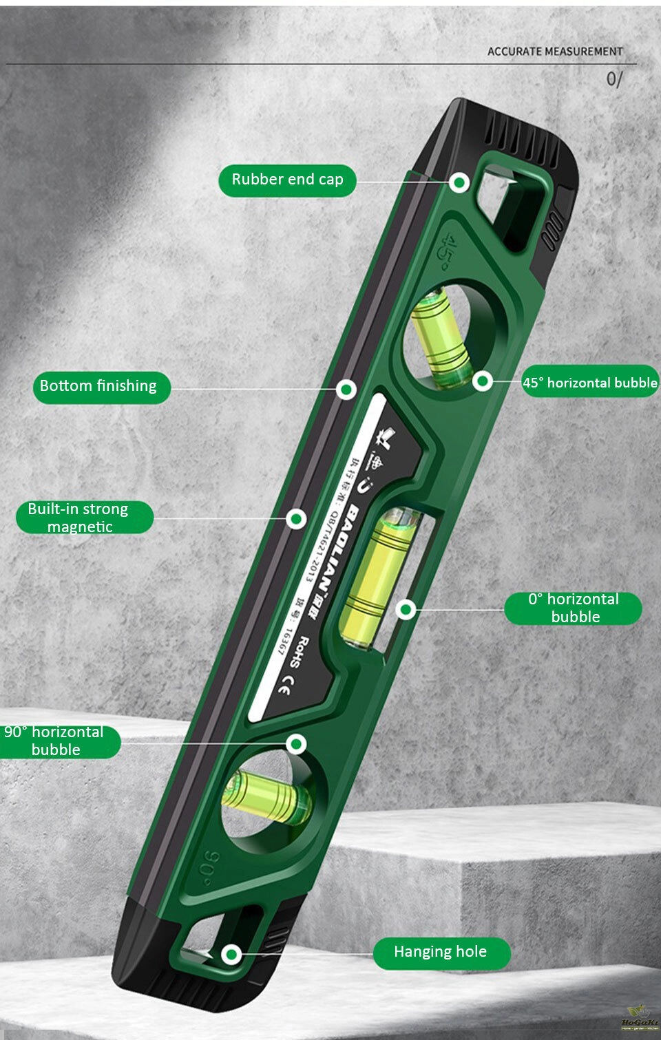 ●3 in1 measurement: equipped with three types of bubbles: 45 ° angle, horizontal, and vertical, for easy operation and use in corresponding situations.