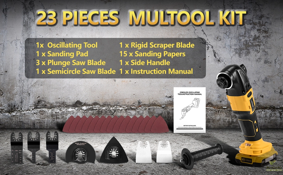 【23PCS Multi-functional Tool Kit】Oscillating tool kit comes with tool-free quick blade installation accessories, Oscillating tool*1, Auxiliary Handle*1, Straight Saw Blade*3, Segment Saw Blade*1, Flexible Scraper*1, Sanding Pad Holder*1, Sanding Paper*15