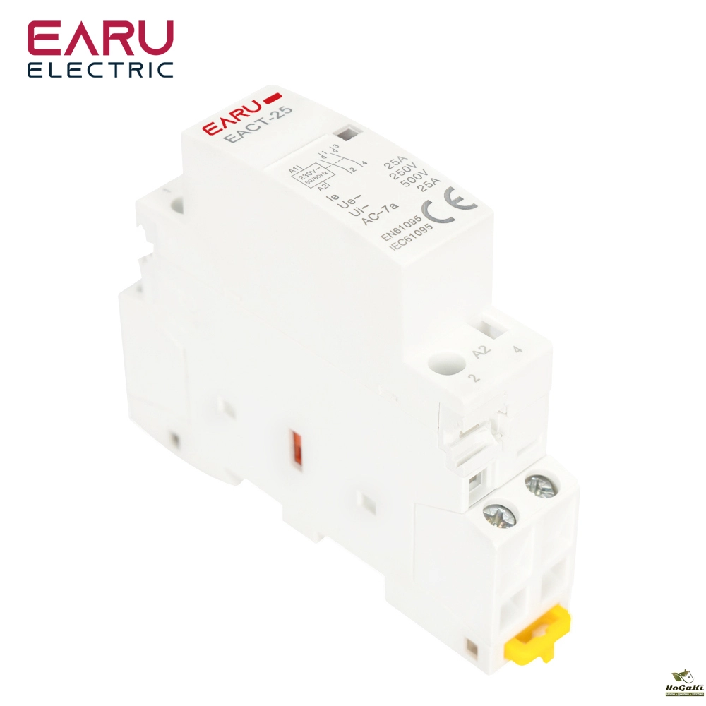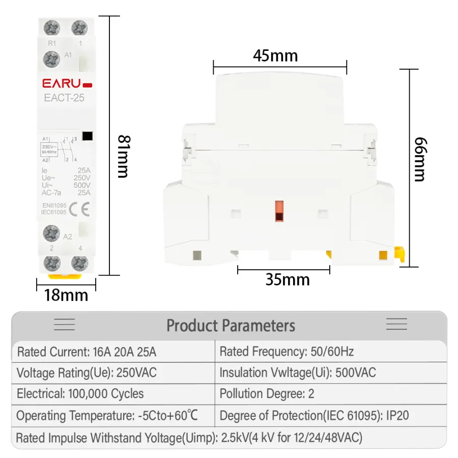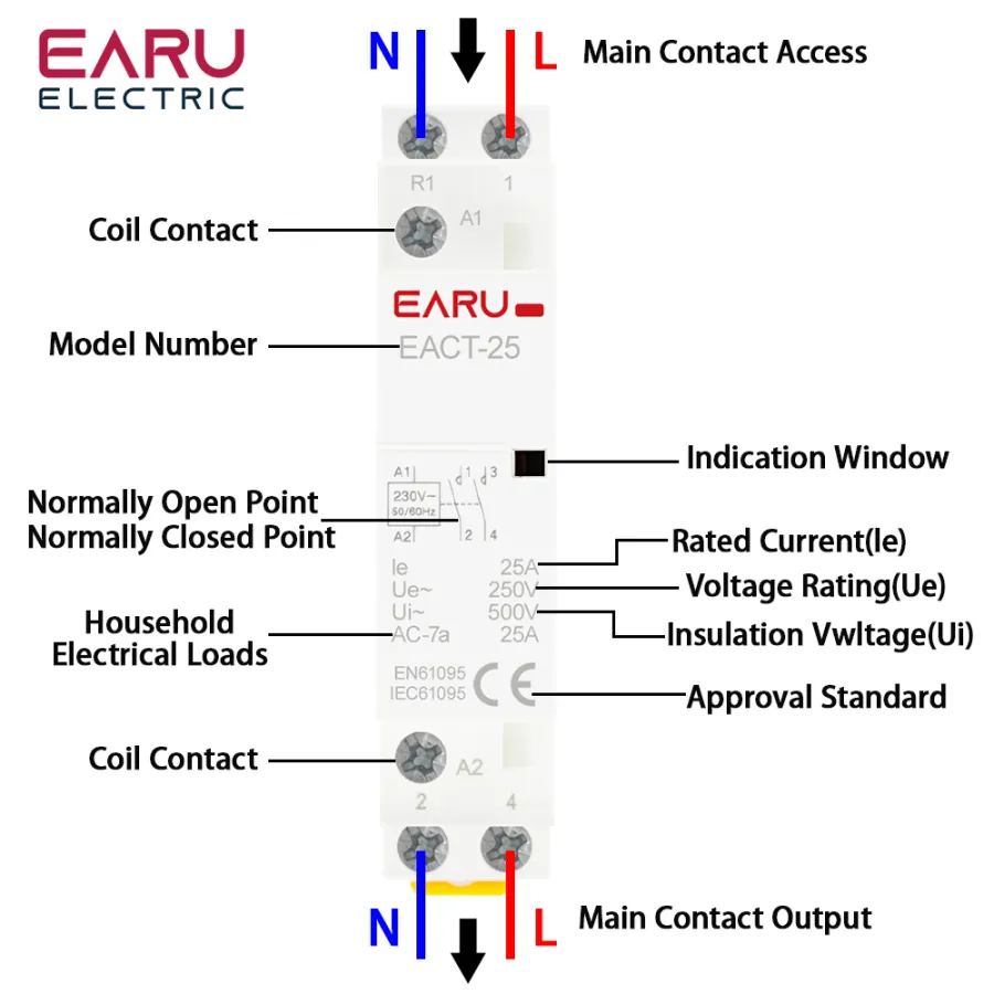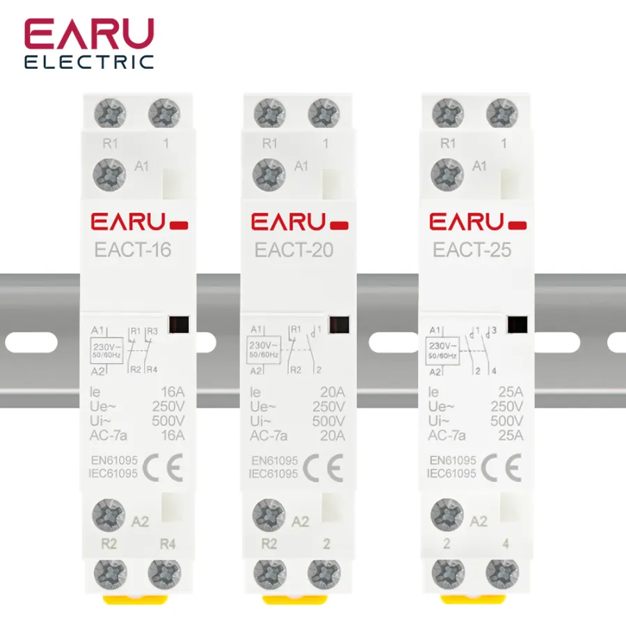 EACT 16A 20A 25A House hold AC contactor is mainly designed for AC 50Hz or 60Hz circuits with 230V .Rated operating voltage in AC7a usage ,rated operating voltage up to 230V, rated operating current up to 25A, Rated operating voltage in AC7b usage , rated current to 10A. Using in breaking capacity below 6kA circuit. For distance connect or break the circuit.