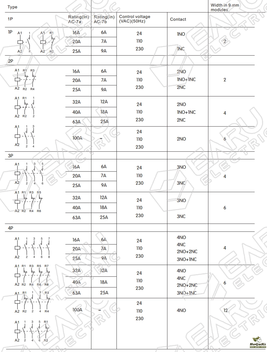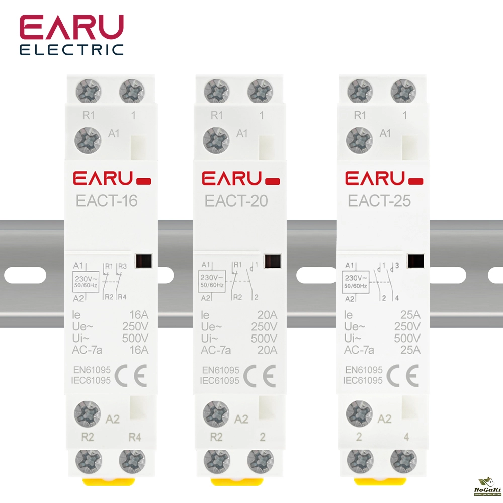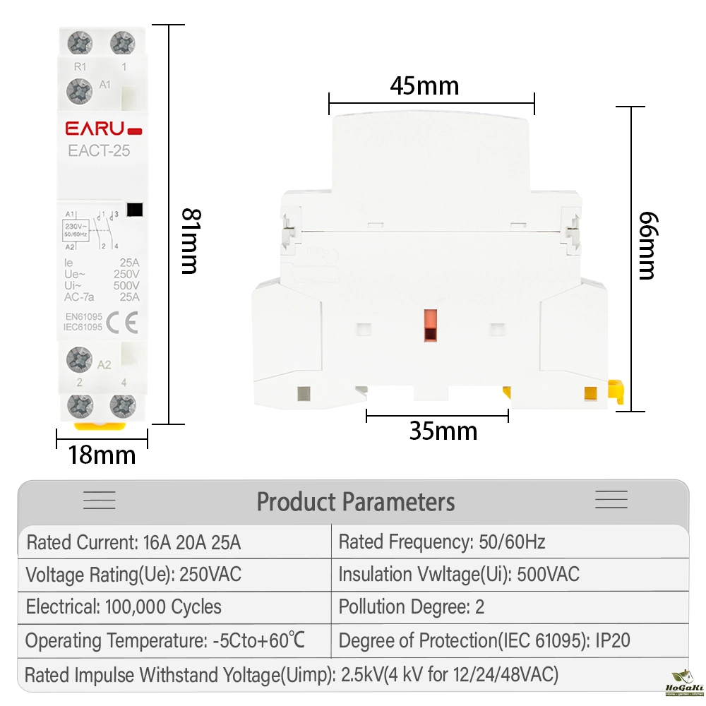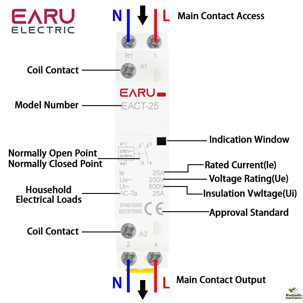 EACT 16A 20A 25A House hold AC contactor is mainly designed for AC 50Hz or 60Hz circuits with 230V .Rated operating voltage in AC7a usage ,rated operating voltage up to 230V, rated operating current up to 25A, Rated operating voltage in AC7b usage , rated current to 10A. Using in breaking capacity below 6kA circuit. For distance connect or break the circuit.