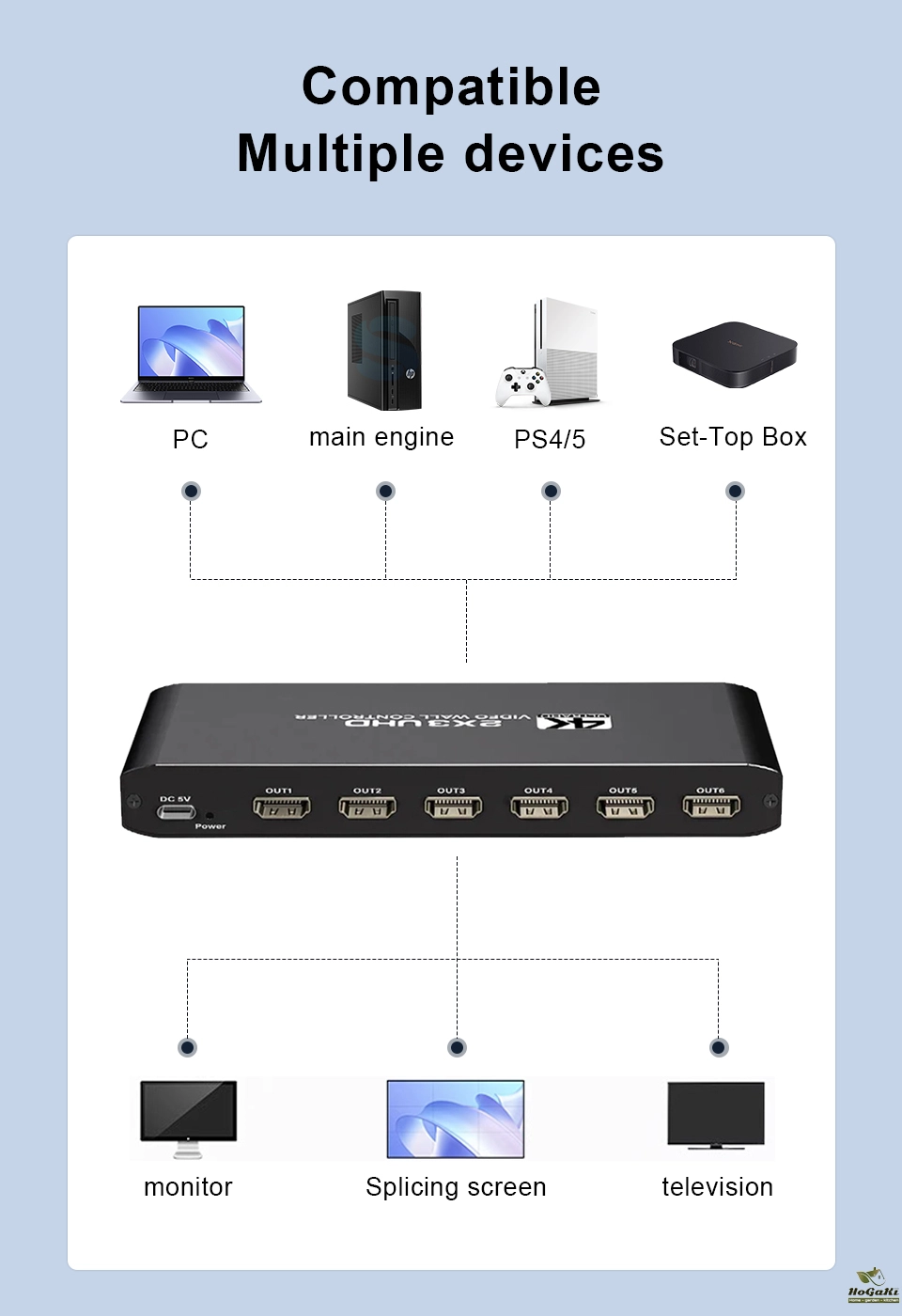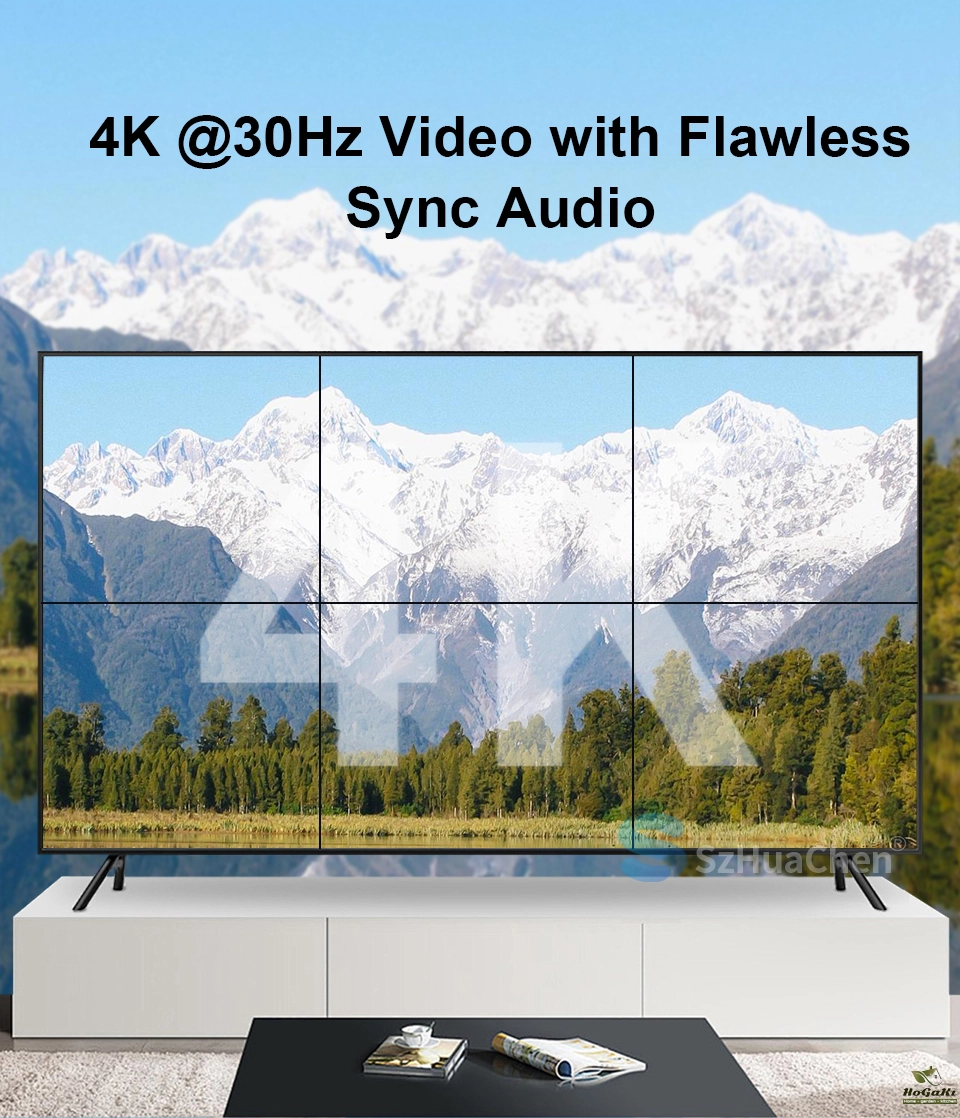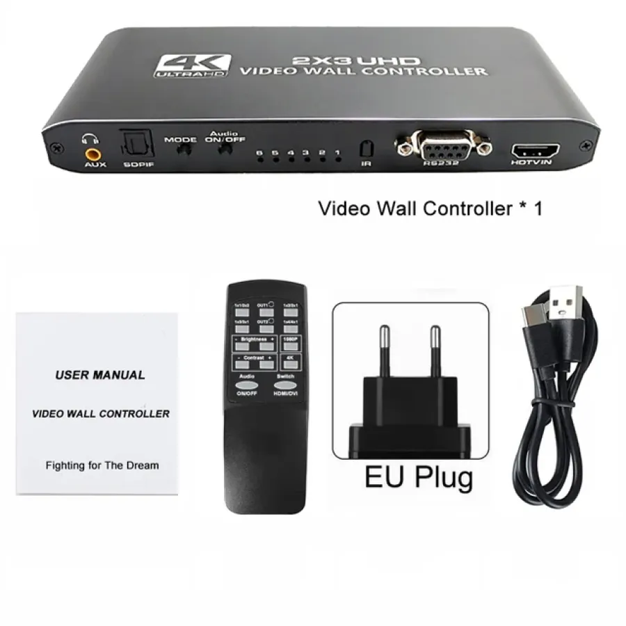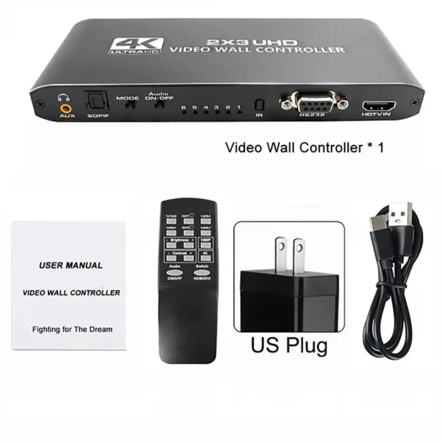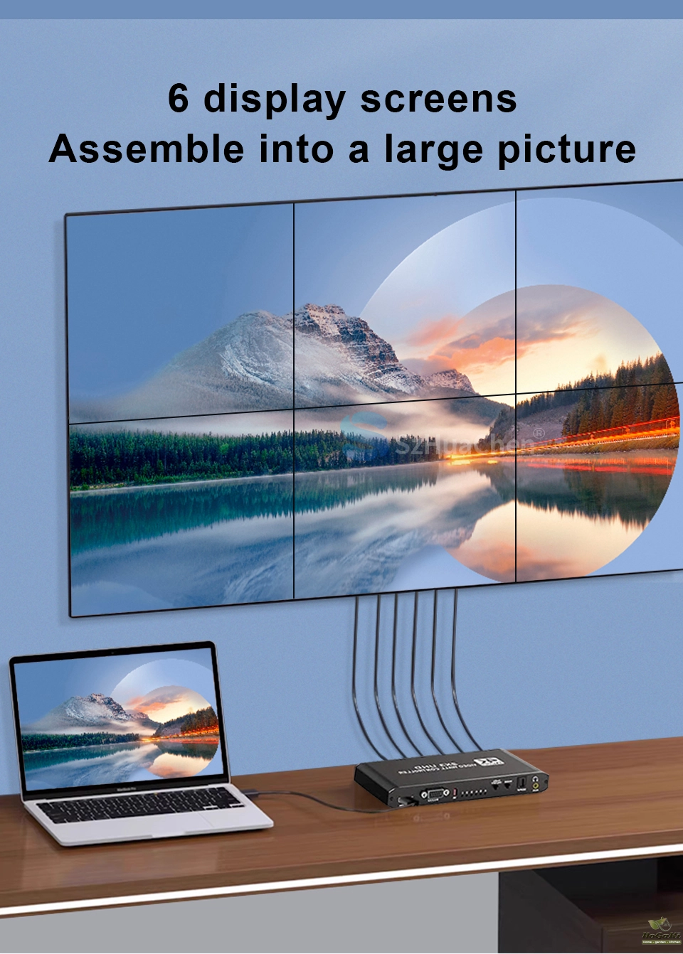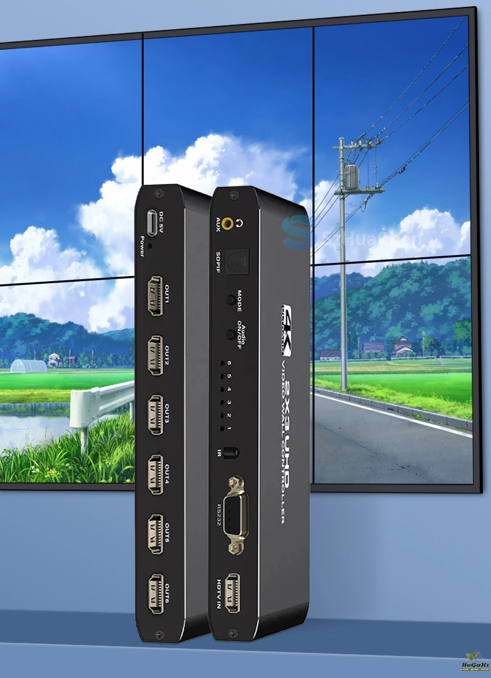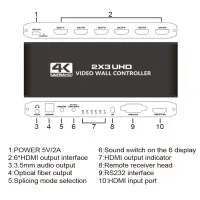 The 4K 2X3 video wall controller, support 1-way HDMI input and 6 HDMl output, the mainfunction is to divide a complete HDMI HD imagesingal into 6 blocks and assign to 6 video display unit(such as rear projection unit, LCD TV, etc.). Completewith 6 HDMI high-definition video display units toform a large dynamic image screen.