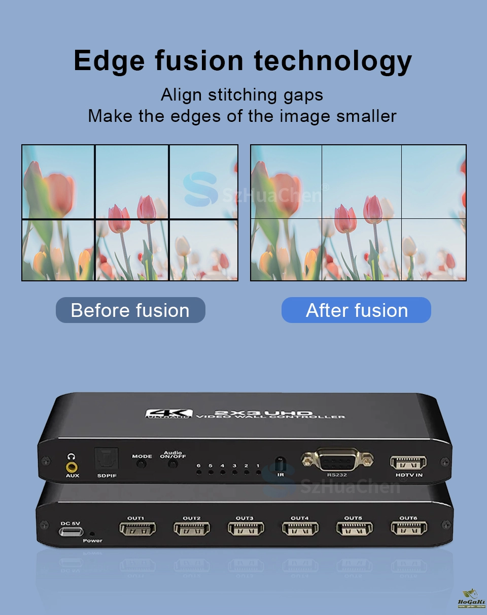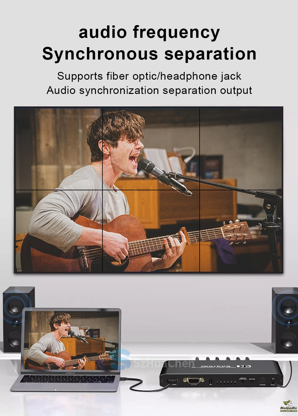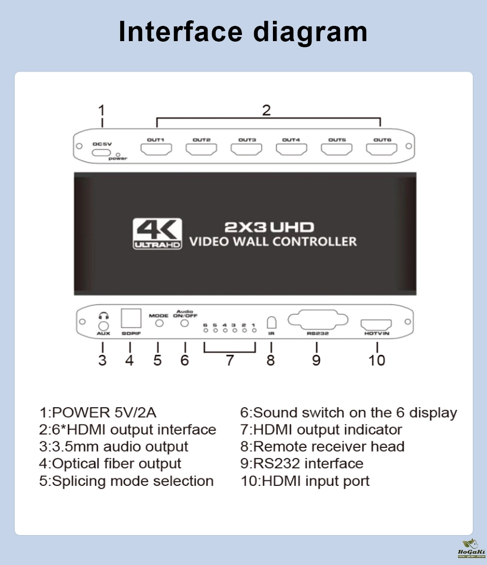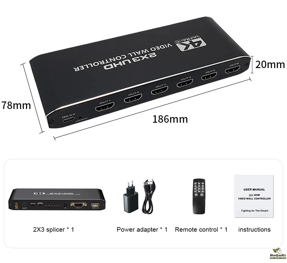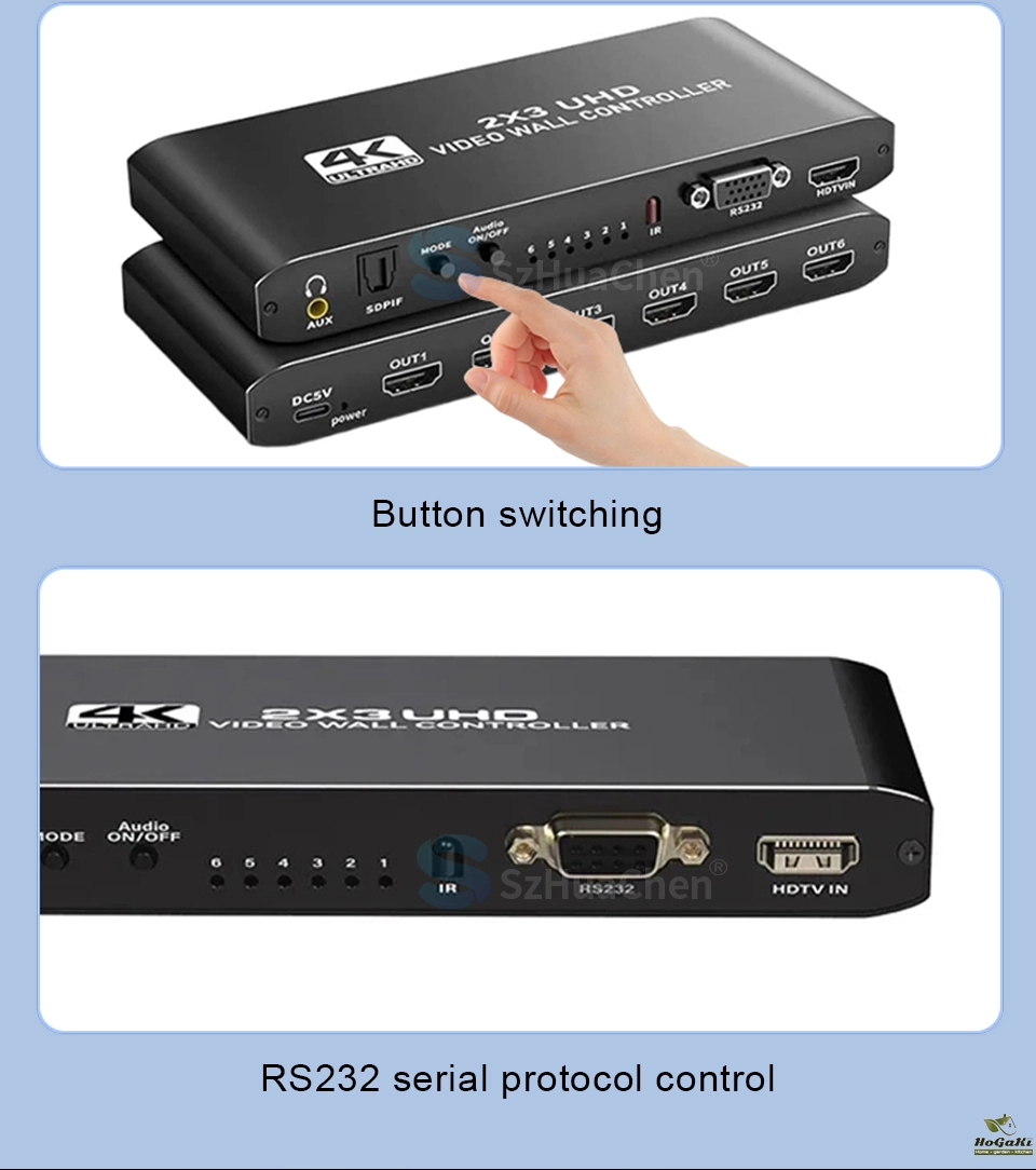 The 4K 2X3 video wall controller, support 1-way HDMI input and 6 HDMl output, the mainfunction is to divide a complete HDMI HD imagesingal into 6 blocks and assign to 6 video display unit(such as rear projection unit, LCD TV, etc.). Completewith 6 HDMI high-definition video display units toform a large dynamic image screen.