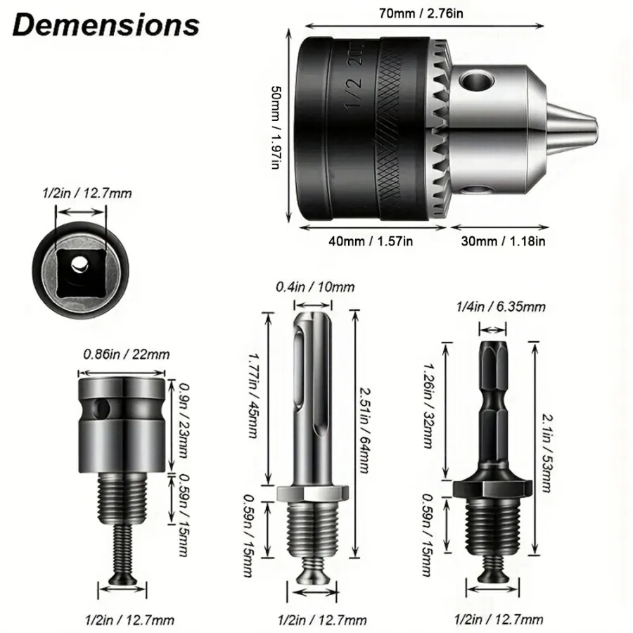 New 13mm Threaded Keyless Metal Drill Chuck, Hex Shank/SDS/Square Quick Grip Adapter, Chuck for Drill Bit Screwdriver Tap&Socket