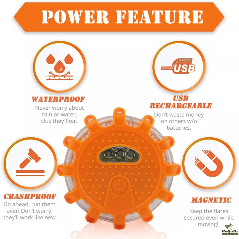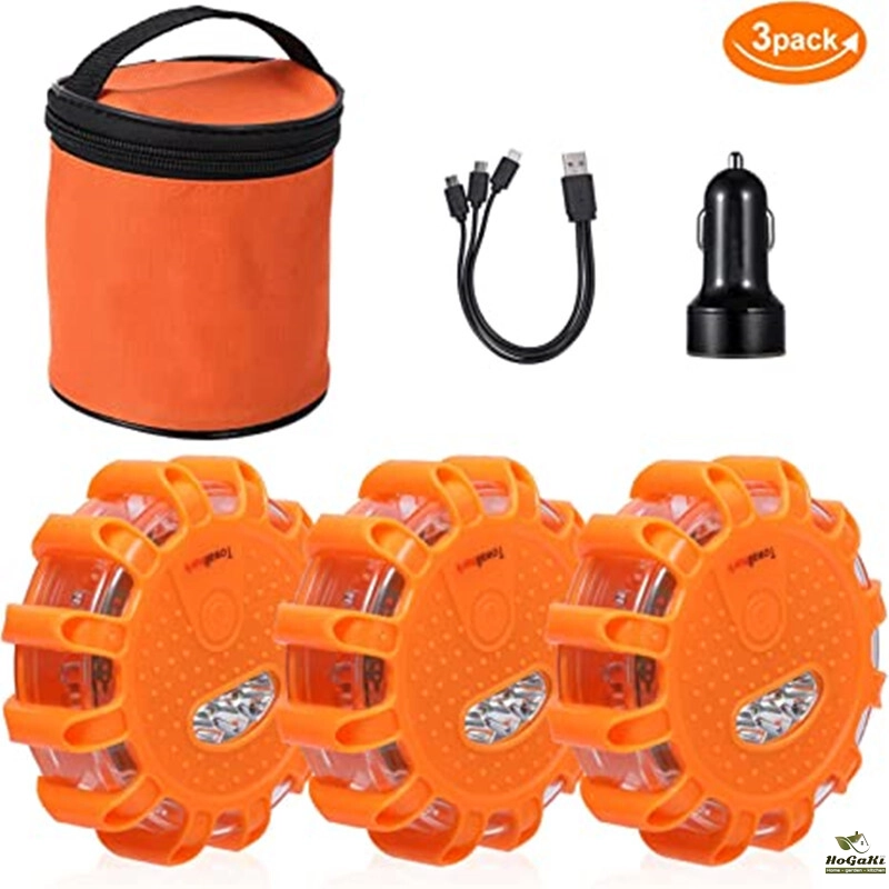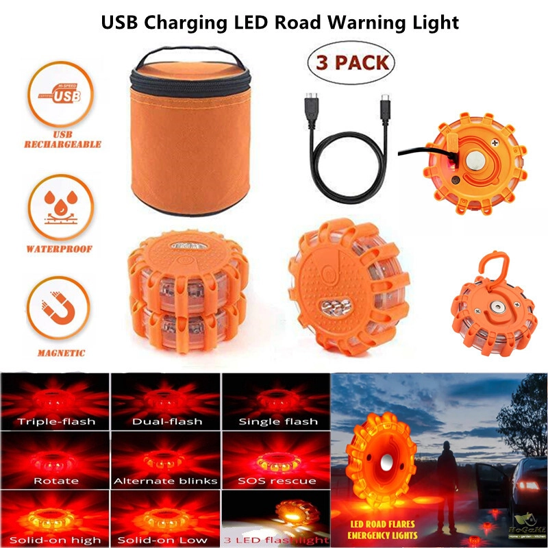 3 Pack LED Road Flares Flashing Emergency Warning Light USB Rechargeable Help Flash Roadside Safety Disc Magnetic Flashing Base