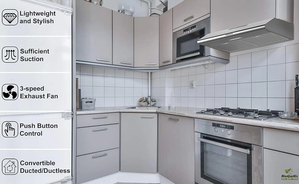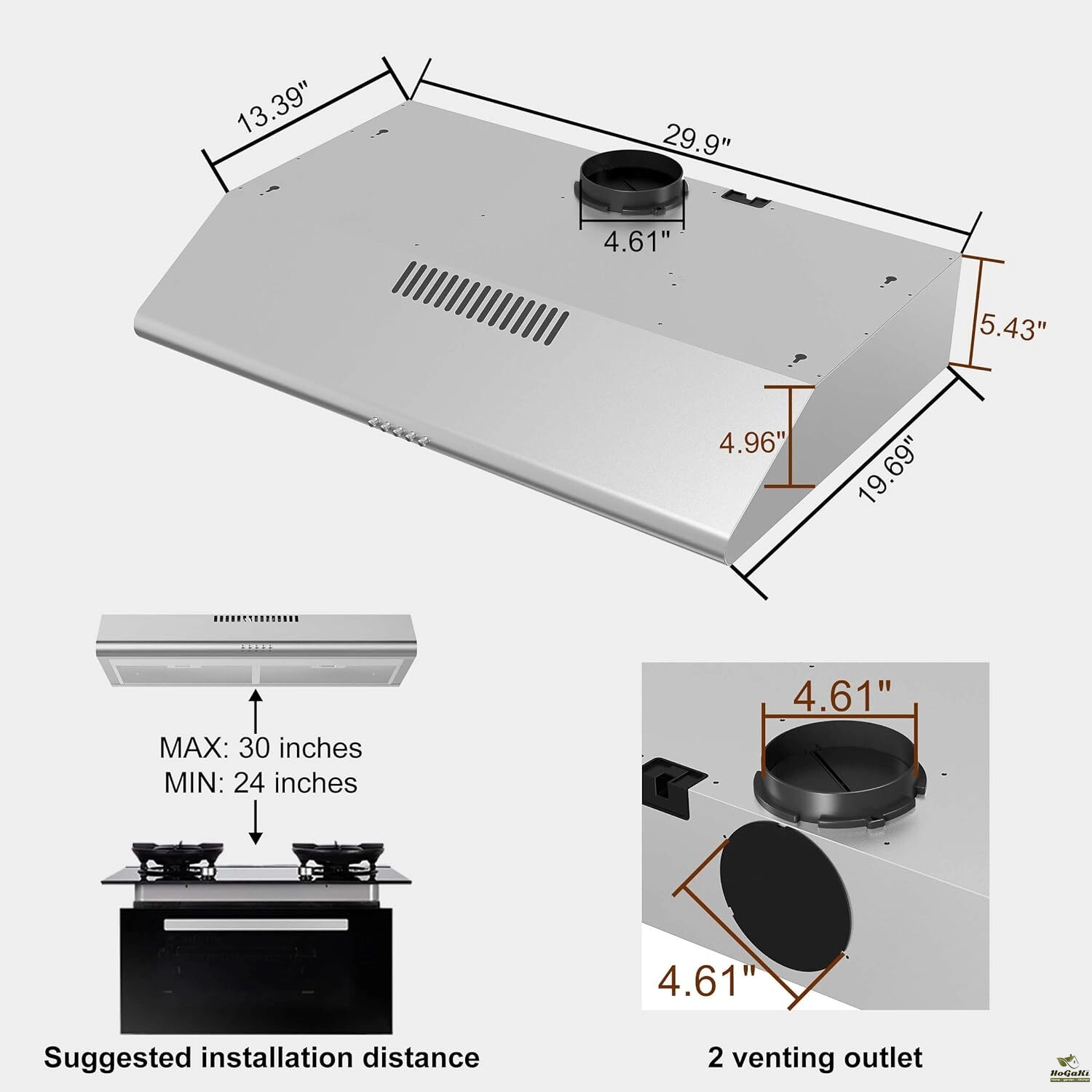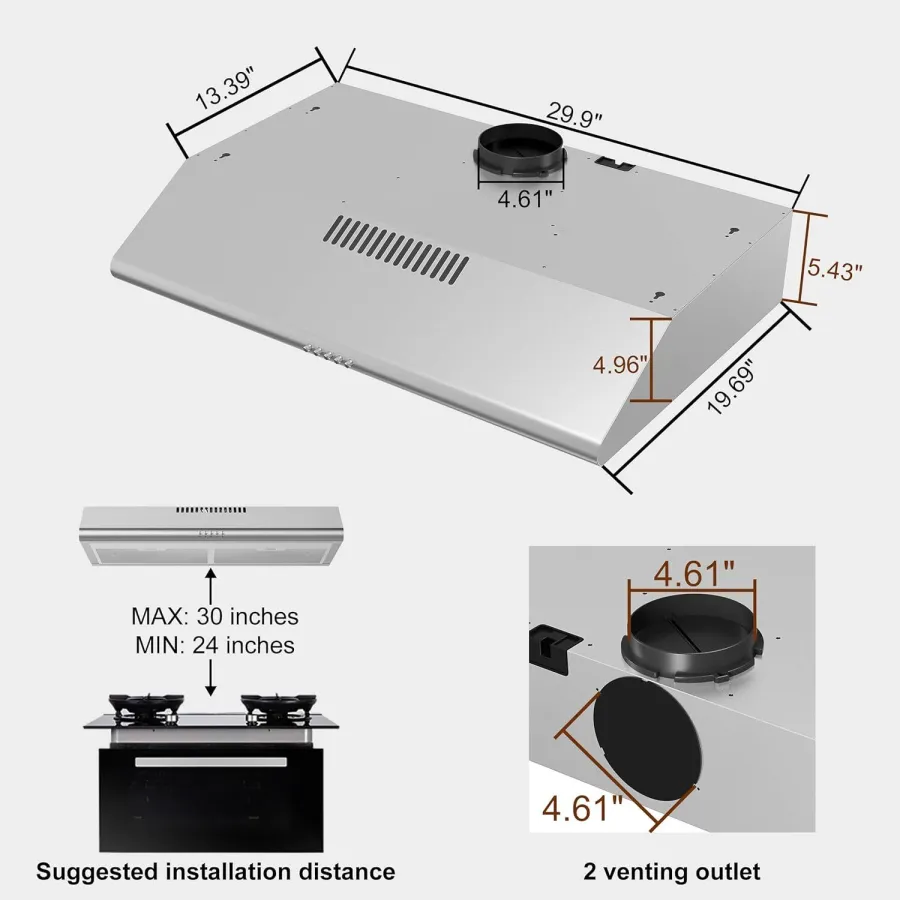 Under cabinet range hood with slim design,saving your kitchen space.The back of the range hood is a little thicker than the front,stove hood is tilt slightly downward in the back after installation.This is a reasonable design, not a product defect. Please refer to the dimension drawing for details.